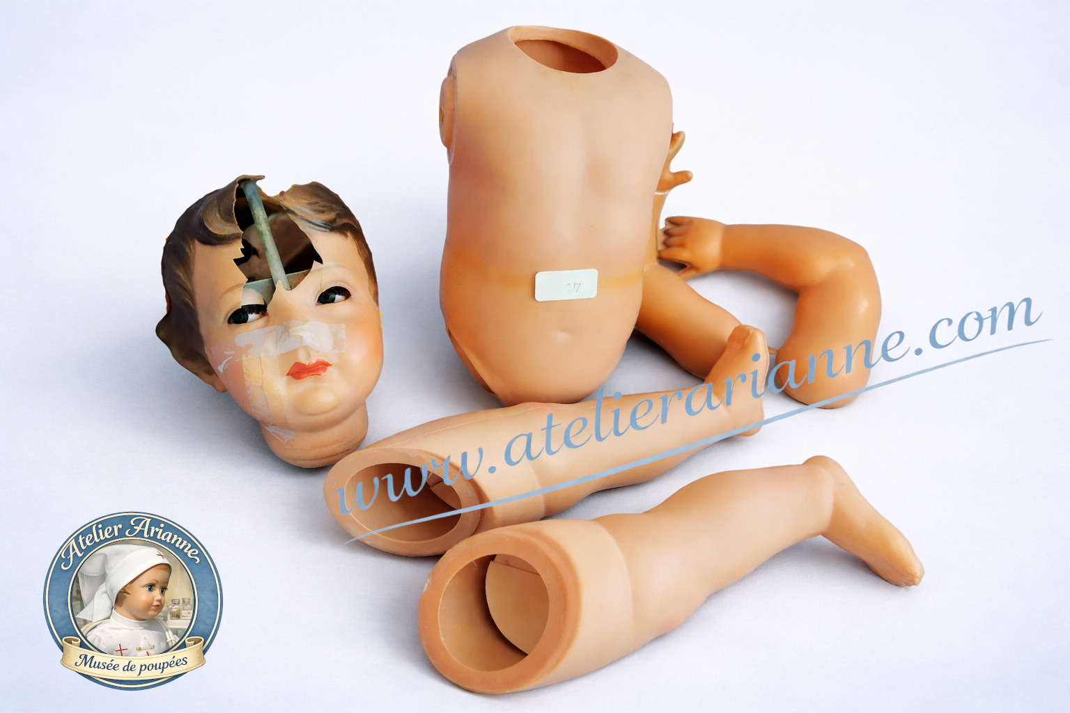 Poupée ancienne démontée avec tête ouverte, yeux et membres séparés – Atelier Arianne musée de poupées.