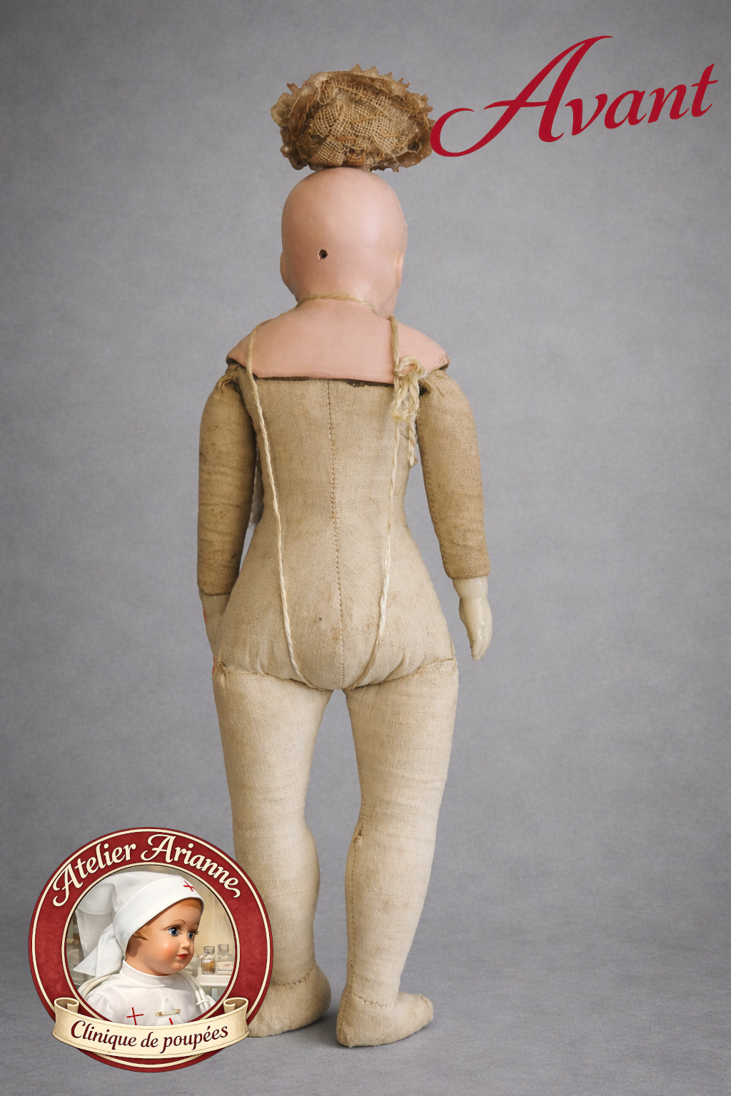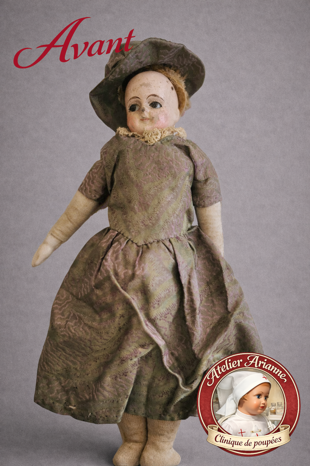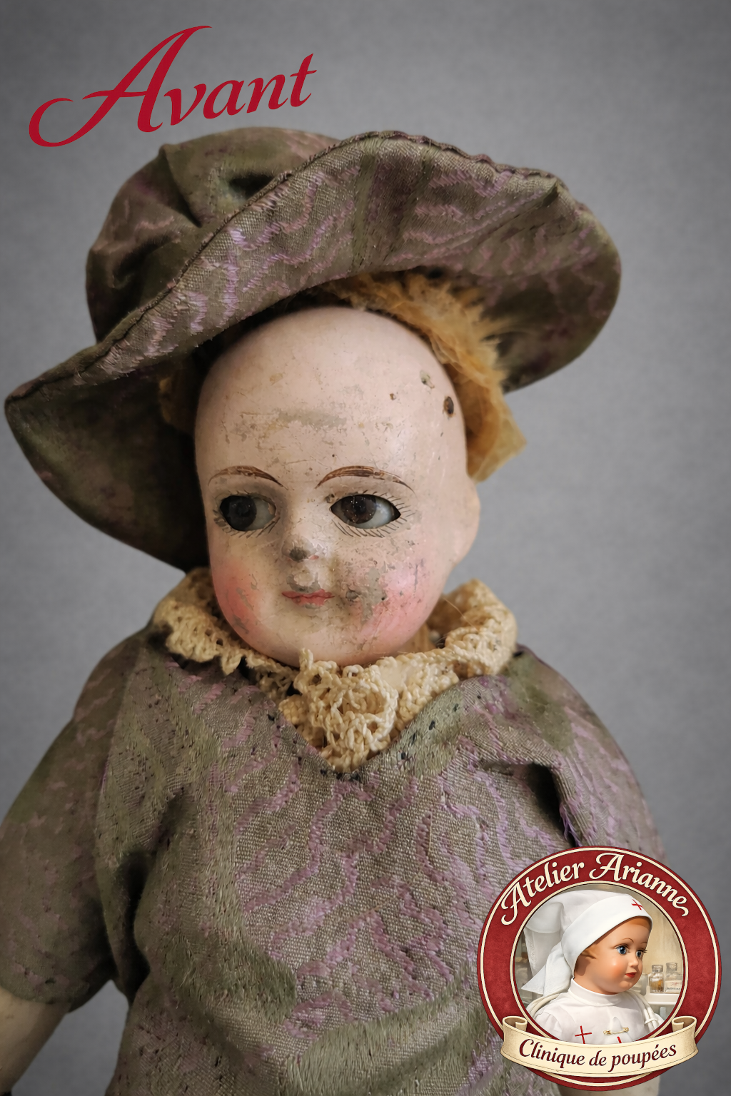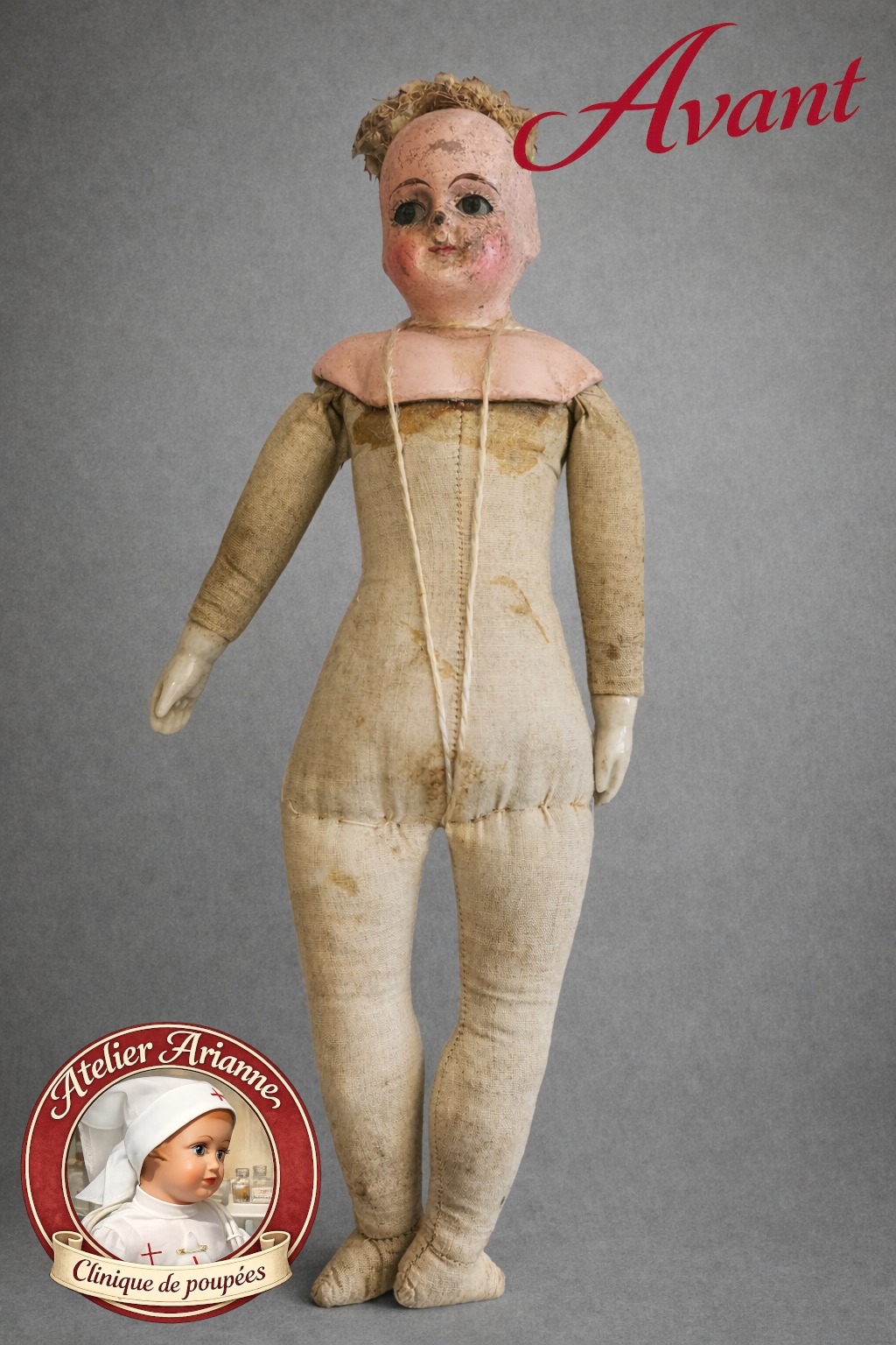 Avant restauration — une poupée fragilisée, mais encore pleine de présence.