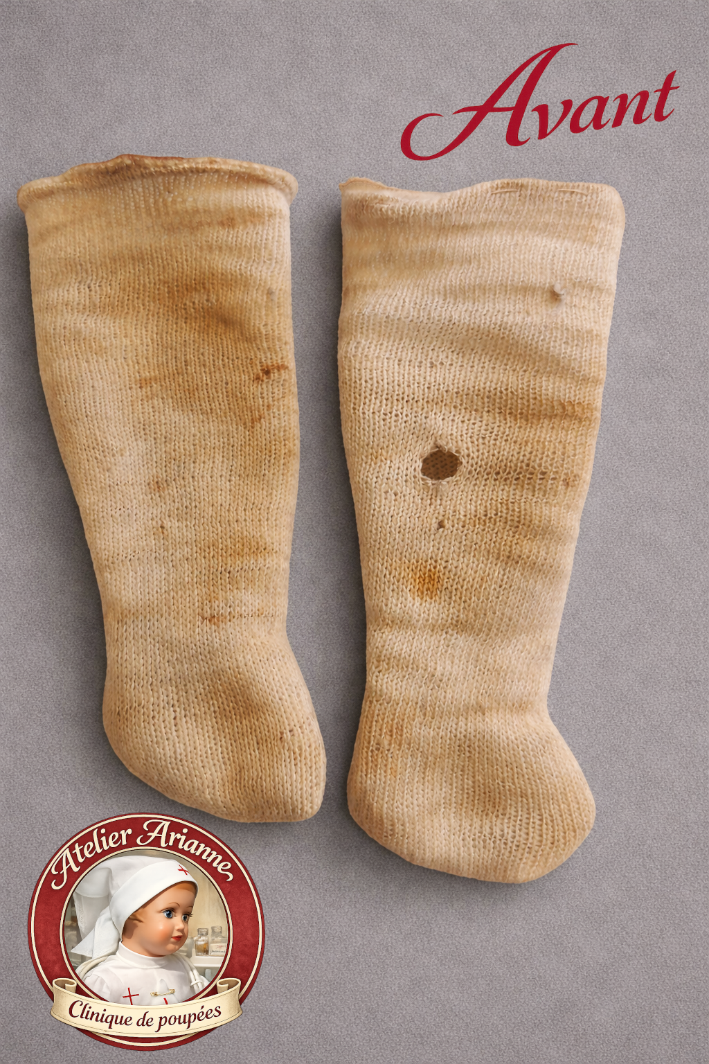 Avant restauration – bas d’origine, marqués par le temps et l’usage, avec décolorations et traces d’usure visibles.
