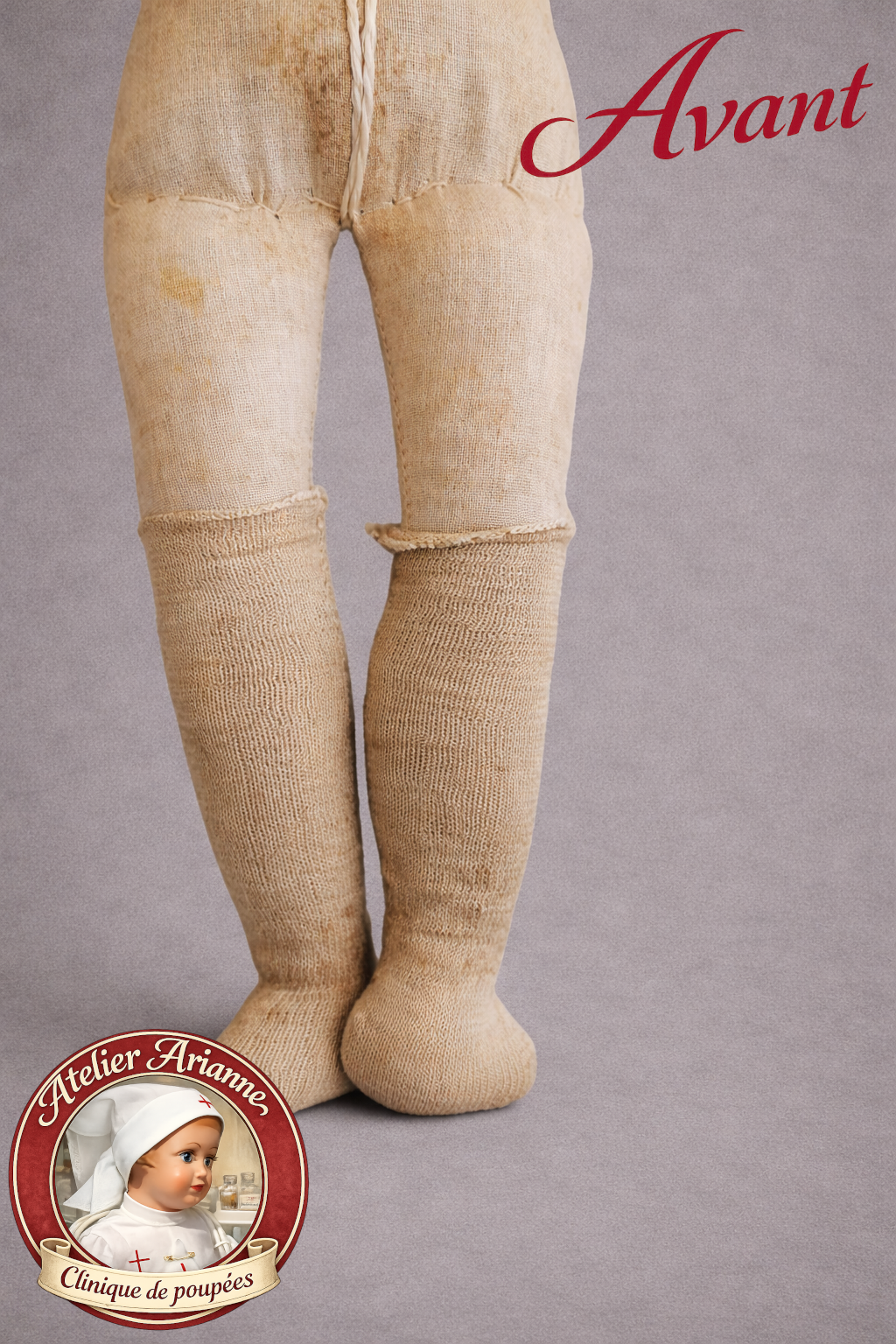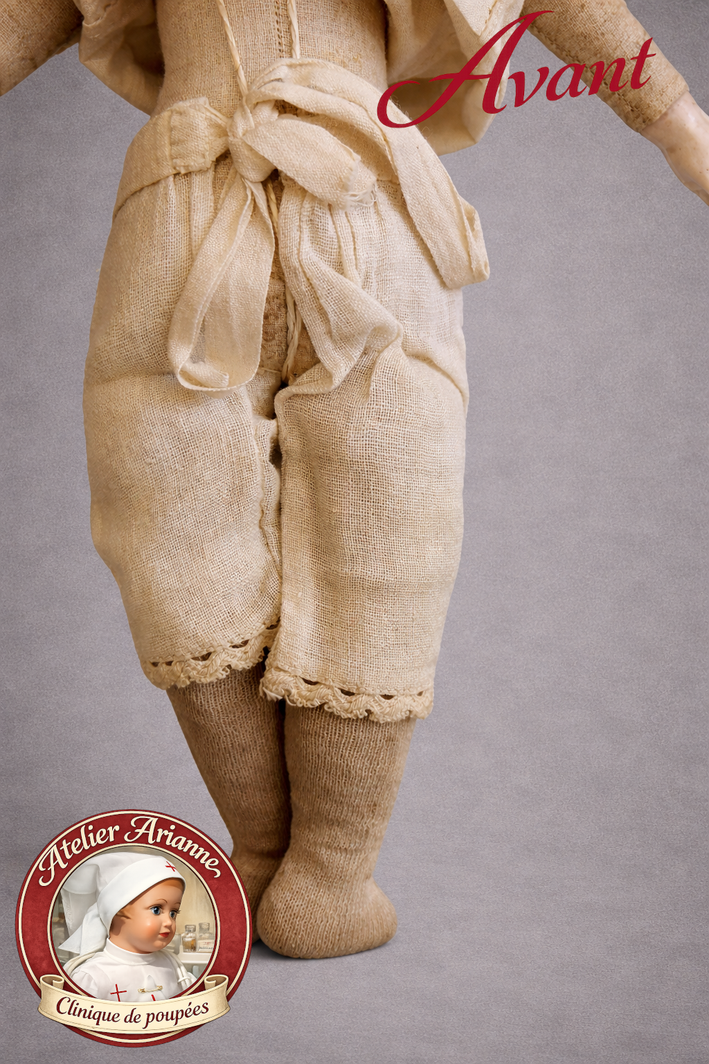 Avant restauration – pantalon long d’origine porté sur la poupée, présentant des décolorations et traces d’usage liées au temps.