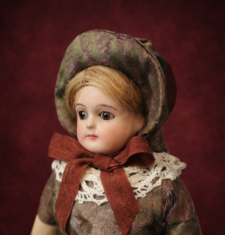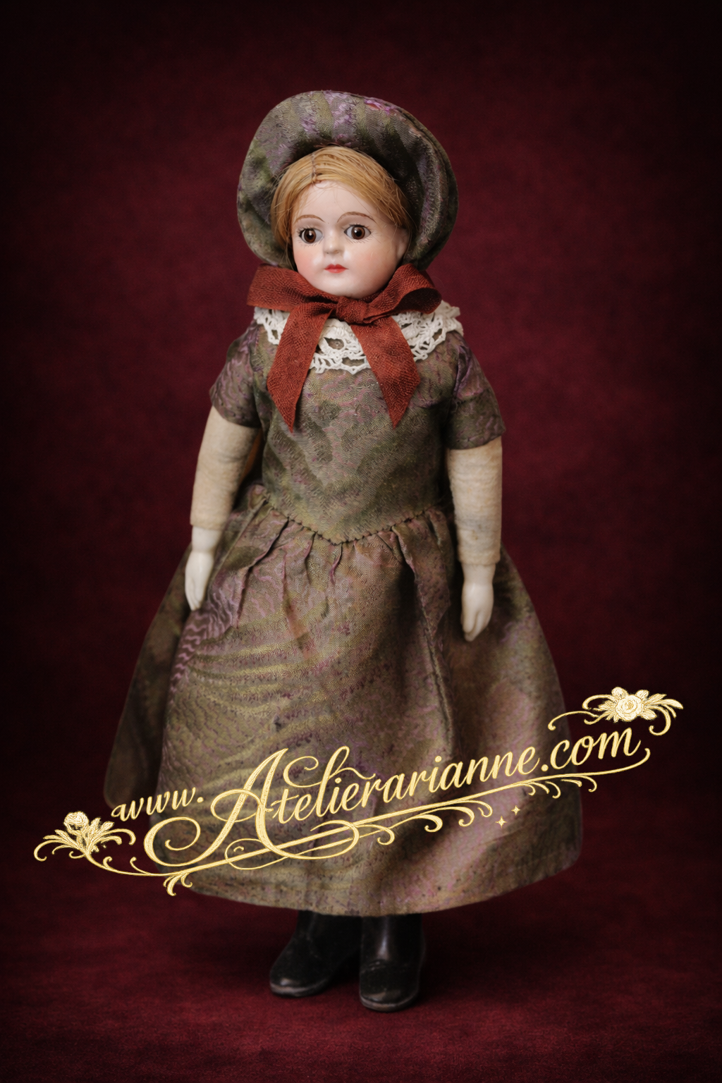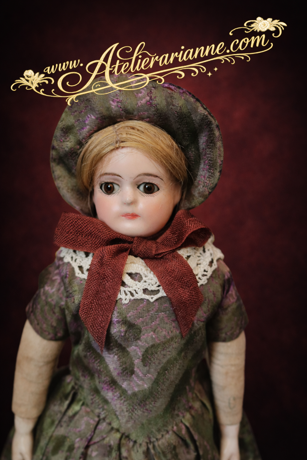 Cette restauration de poupée ancienne concerne une petite mignonette d’environ 16 cm confiée par Monsieur Pierre et Madame Ivette.