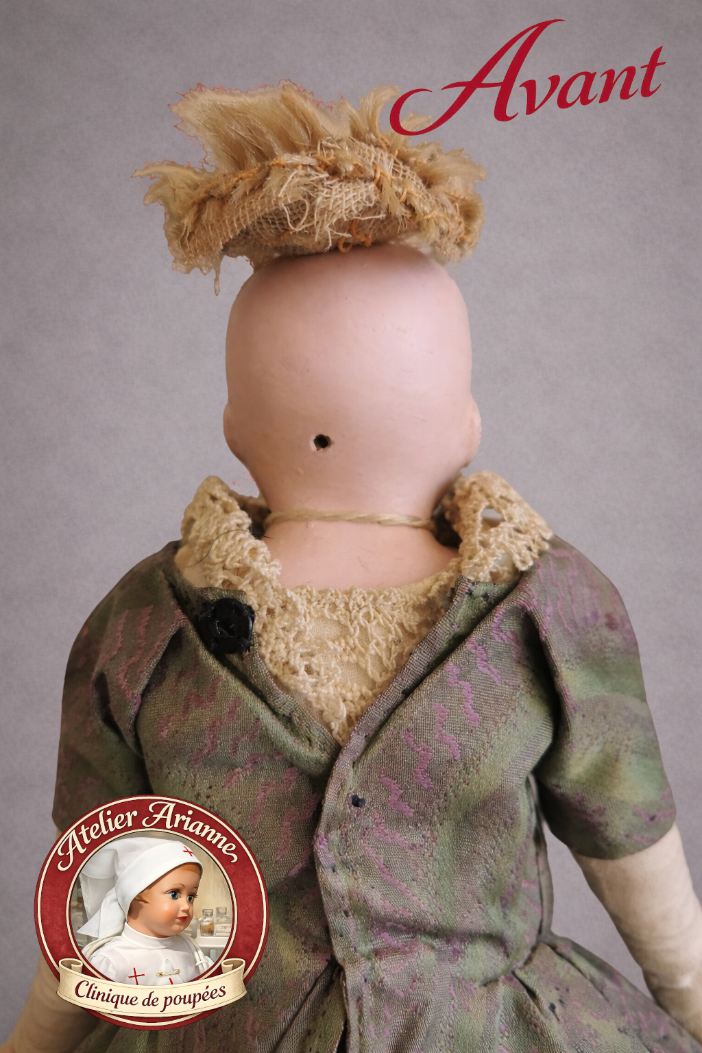 restauration poupée biscuit, clinique de poupées, conservation poupée ancienne, réparation poupée ancienne, perruque poupée ancienne, restauration textile poupée, poupée ancienne famille, poupée ancienne restauration avant après