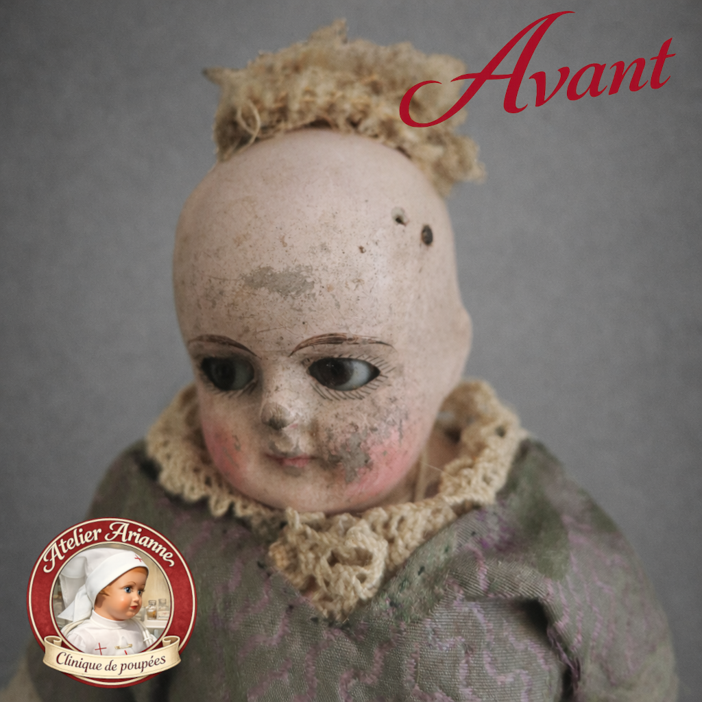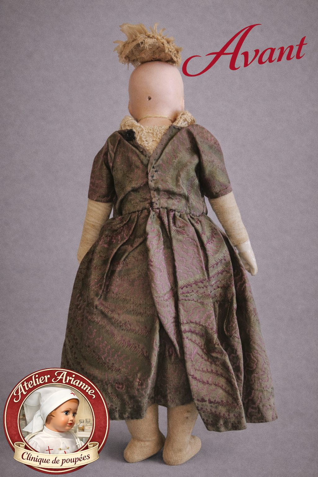 Il s’agit d’une poupée ancienne transmise depuis plusieurs générations, avec une volonté très claire : la préserver au plus proche de son état d’origine, sans jamais trahir son histoire.
