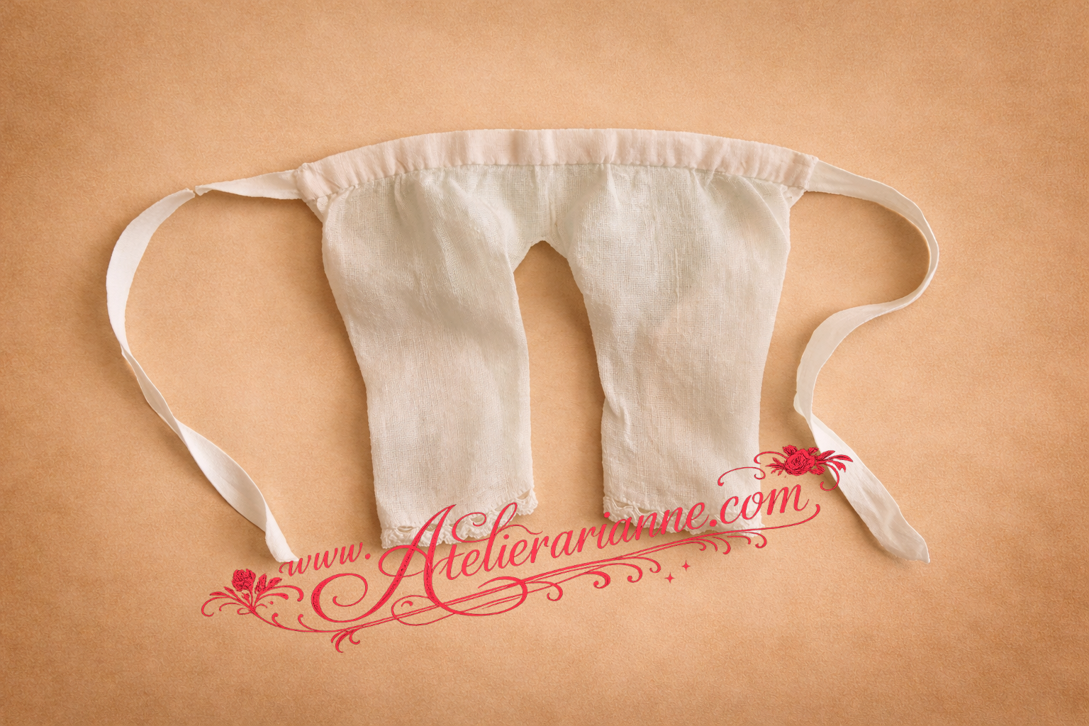 Avant restauration – culotte longue d’origine, avec ruban de maintien, marquée par le temps et l’usage, présentant des traces de jaunissement.