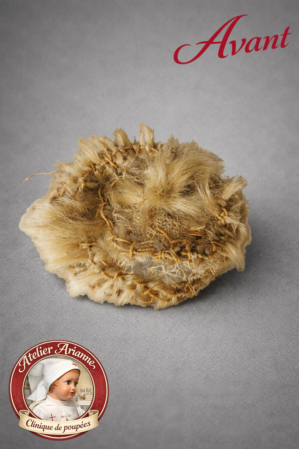 J’ai donc réalisé une pérucque de poupée ancienne à la main, en cheveux naturels, avec une teinte rigoureusement identique.