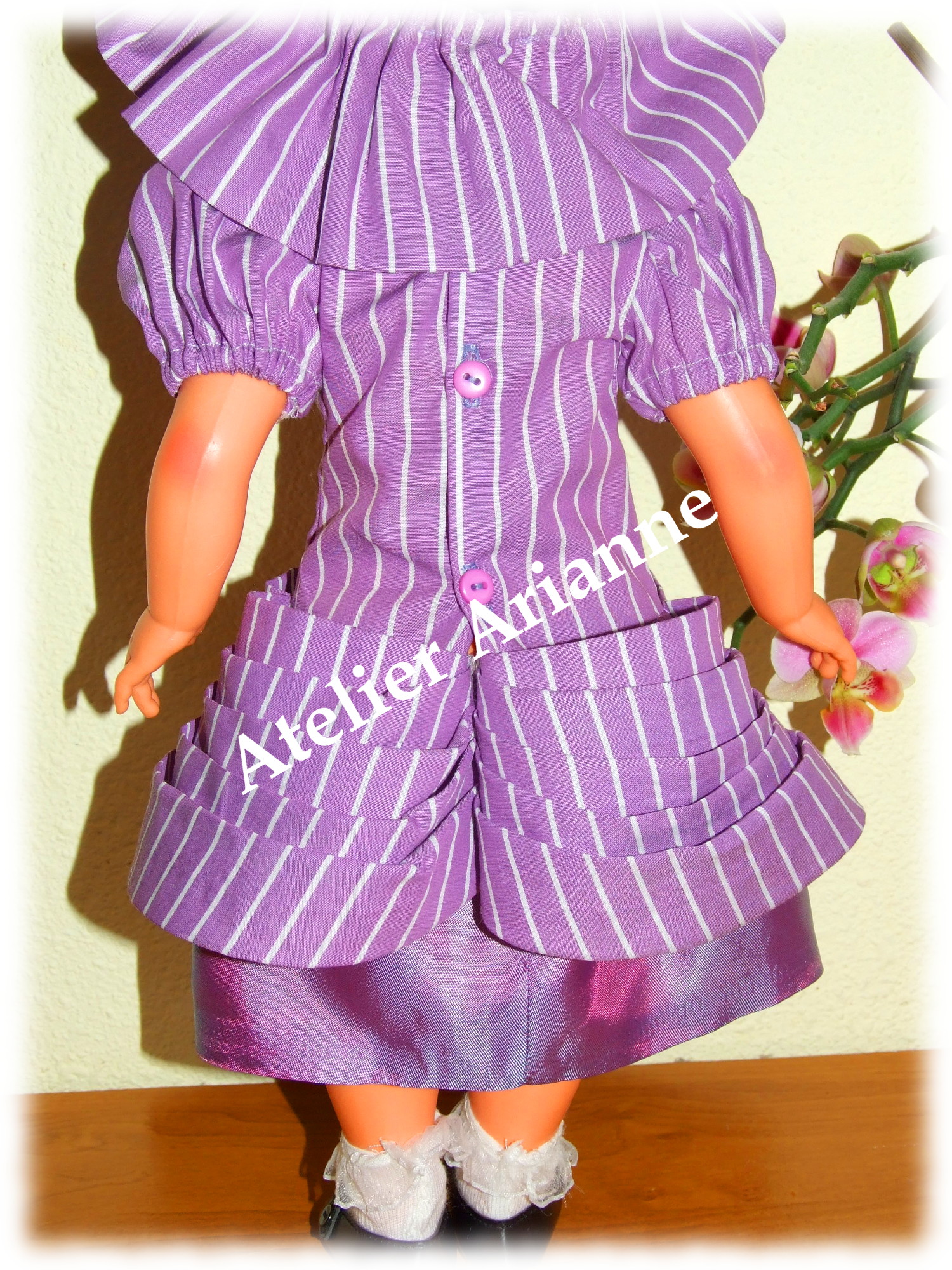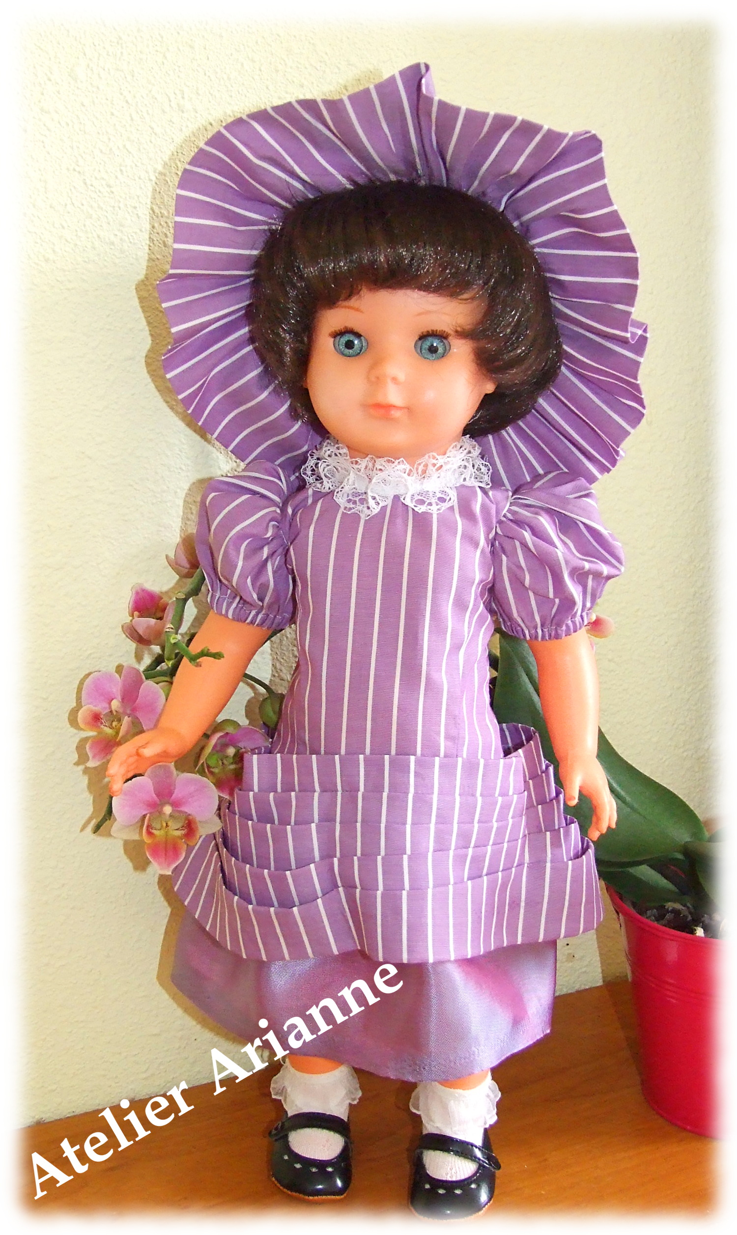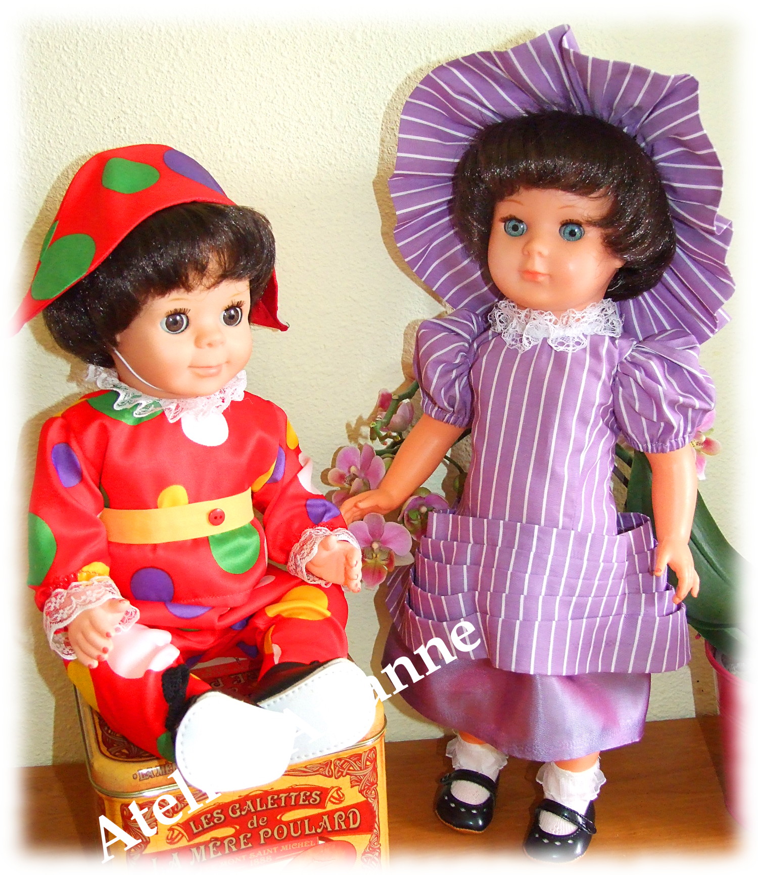 Ensemble presque identique que l’original 🙂 Tenue pour baigneur Michel Date : septembre 1965 Taille : 39 / 40 cm Pièces : 2, body avec chemise et veste Couleur : vert émeraude et marron Matériau : velours et vichy d’époque TweetezPartagezEnregistrerPartagez0 Partages