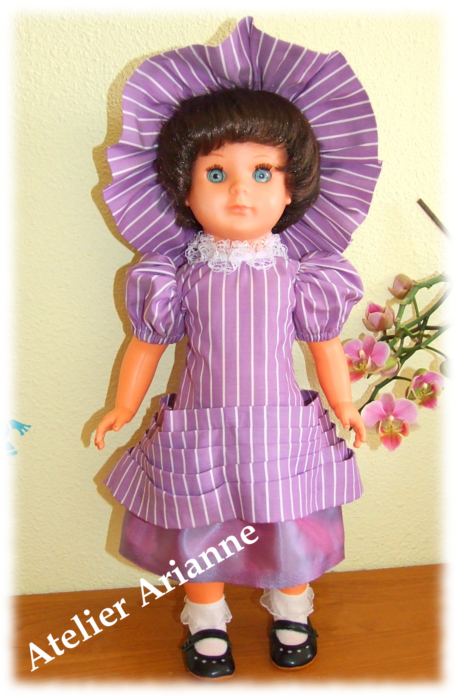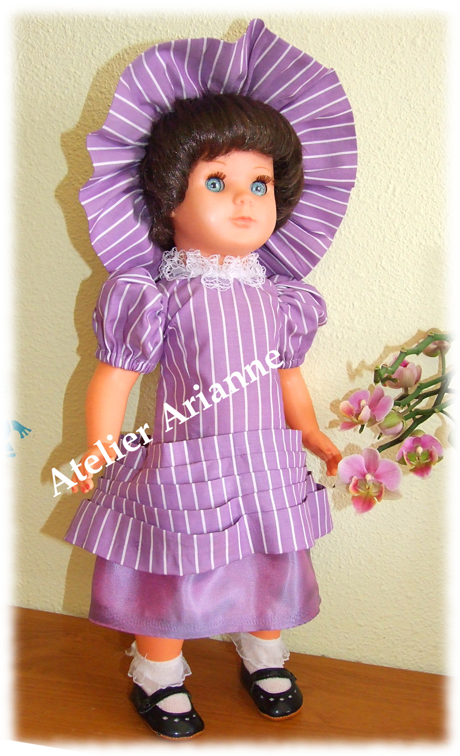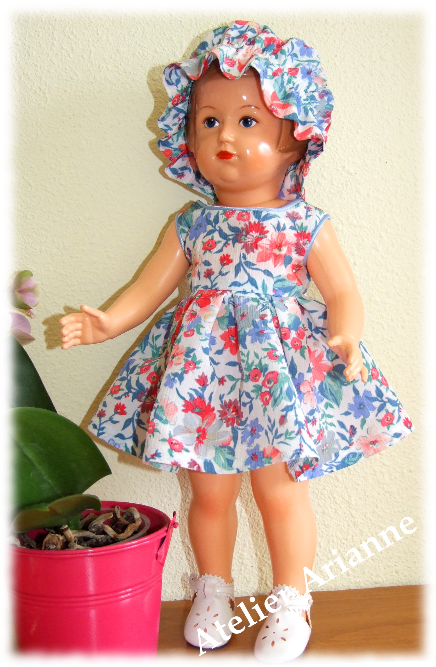 Ensemble presque identique que l’original 🙂 Tenue pour baigneur Michel Date : septembre 1965 Taille : 39 / 40 cm Pièces : 2, body avec chemise et veste Couleur : vert émeraude et marron Matériau : velours et vichy d’époque TweetezPartagezEnregistrerPartagez0 Partages