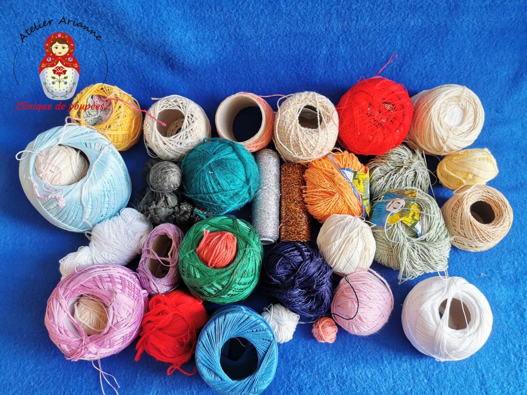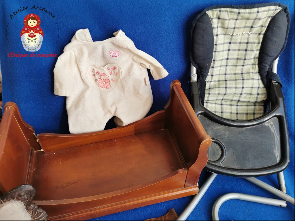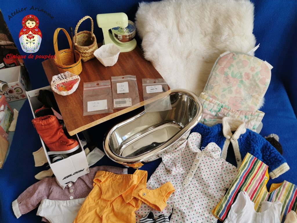 Nous avons reçu un petit lit en bois, des chaussures, des meubles pour poupées fabriqués par le fils de Mme Catherine, des vêtements, des cils. Une magnifique poupée avec une tête en composite, je pense qu’il s’agit d’une marque allemande, mais je dois prendre le temps de l’identifier. De la fourrure artificielle, deux Cathy de Raynal dans leurs vêtements d’origine et du fil fin pour confectionner des chaussettes pour poupées.