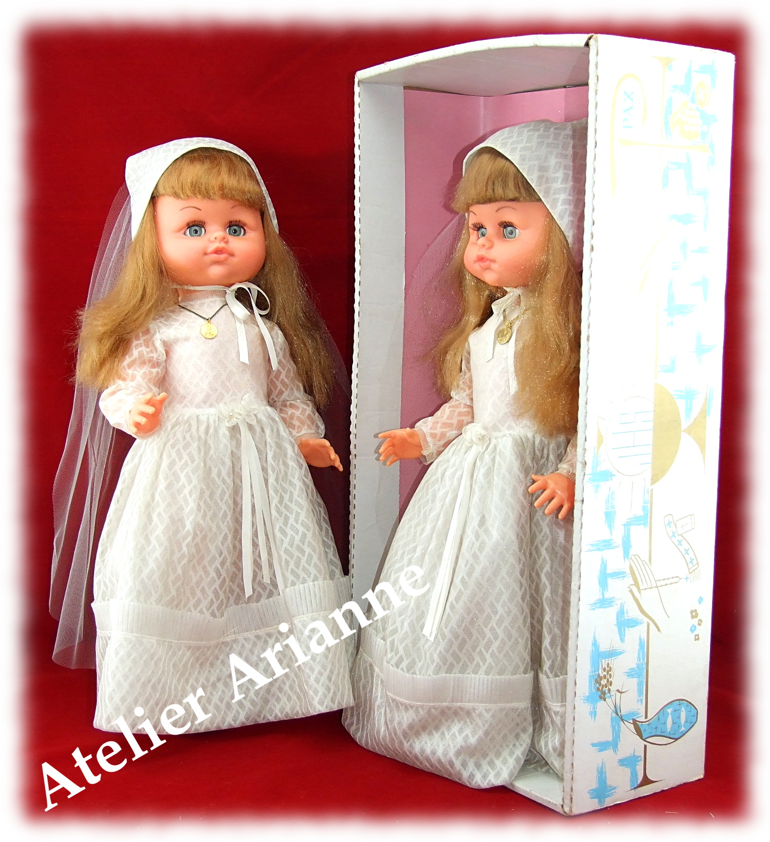 Bonsoir a tout le monde , Aujourd’hui j’aimerais vous présenter deux adorables jumelles de marque Jesmar <3 Les deux portent le prénom ” Micaela ” . Elles mesurent 45 cm. Celle a droite est dans sa boite d’origine , Les deux portent des superbes tenues entièrement d’origine <3 Leur référence est 924 46 Sur la boite il y a marqué ” Recuerdo de mi Primera Comunion ” Personnellement j’aime particulièrement ces poupettes, je trouve qu’elles ont énormément de charme avec leurs tenues si belles … Gros bisous Dorothée