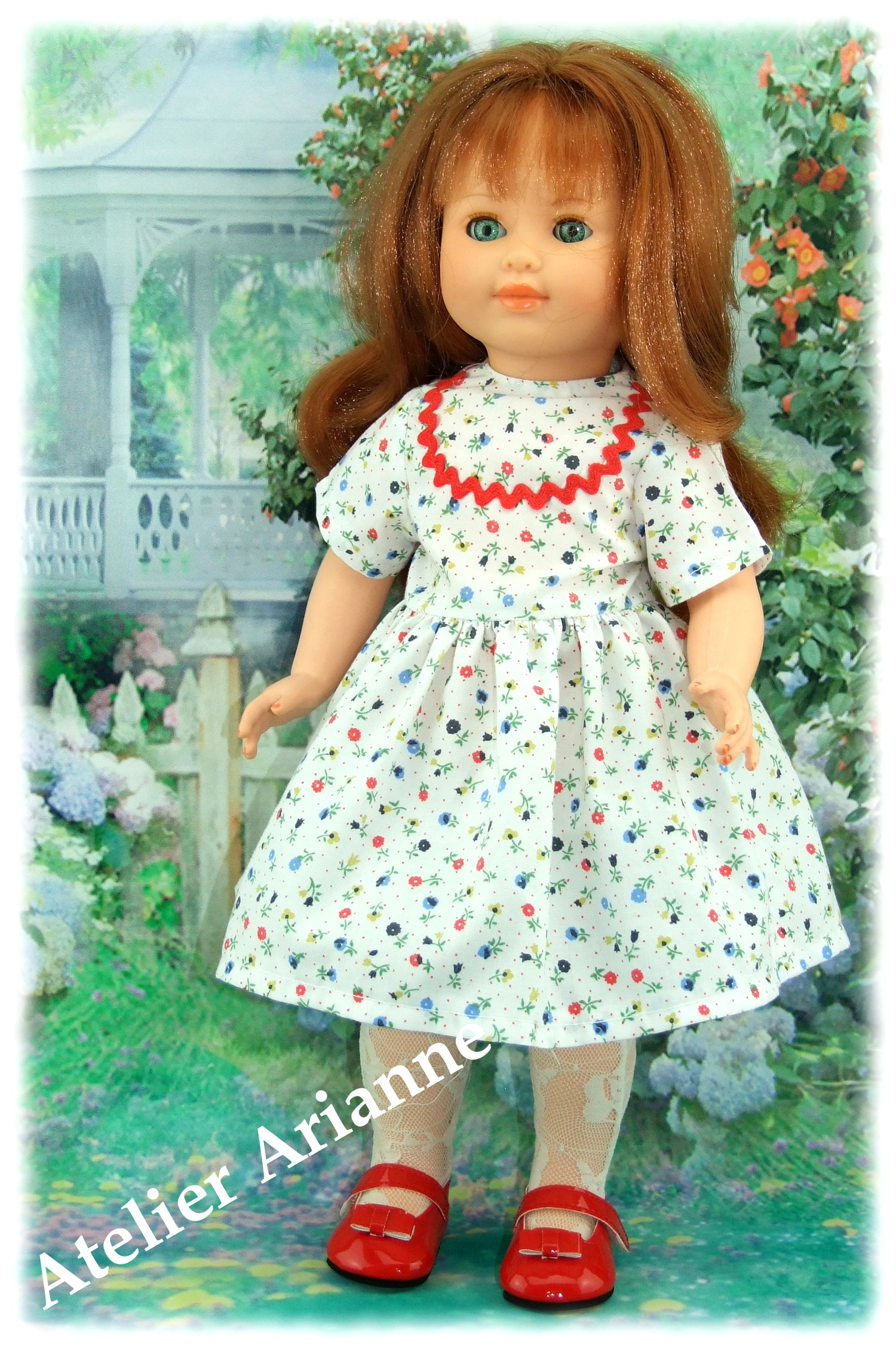 Tenue pour poupée Françoise et Marie-Françoise Modes et Travaux Date : Juin 1976 Poupée : Françoise et Marie-Françoise Taille : 39 / 40 cm 1 pièce : la robe Couleur : blanc et rouge Matériau : coton imprimé ancien
