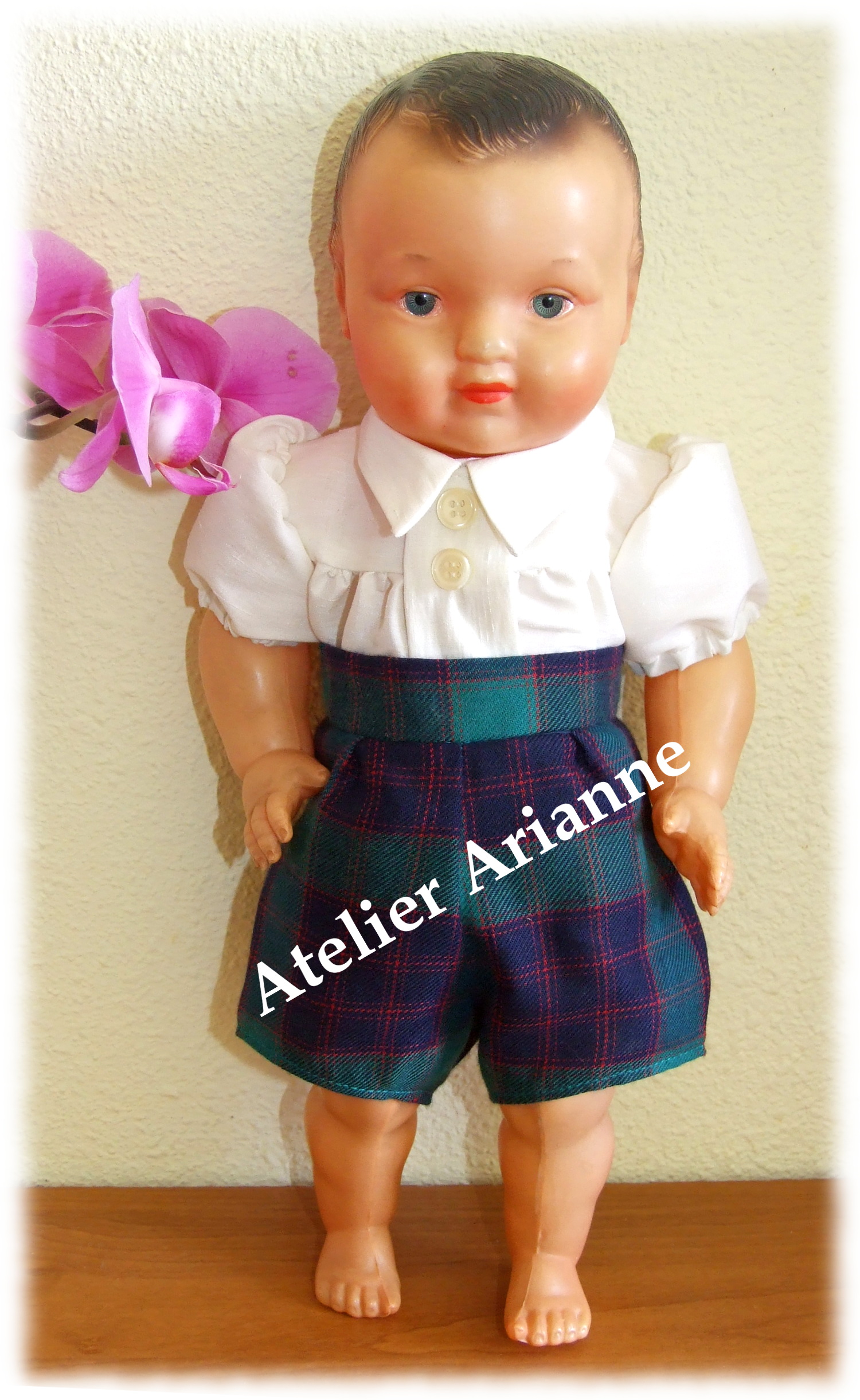 Tenue Lucien pour baigneur François, Jacky, et autres de 33-35 cm 2 pièces : le short et le chemisier Matériau : coton et lainage ancien