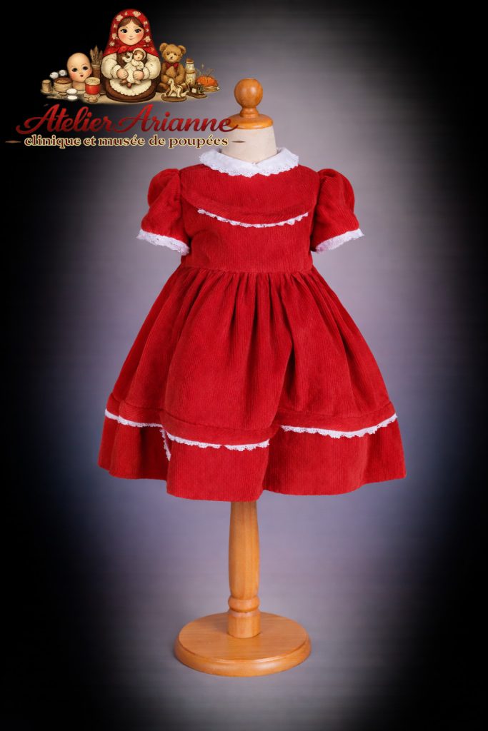 Les finitions sont particulièrement remarquables : de délicats détails en dentelle blanche ornent la tenue, soulignant le soin apporté à chaque élément. Ces touches romantiques renforcent le charme authentique de la poupée et rappellent l’esthétique des créations anciennes.