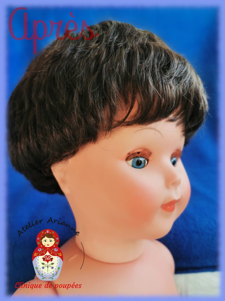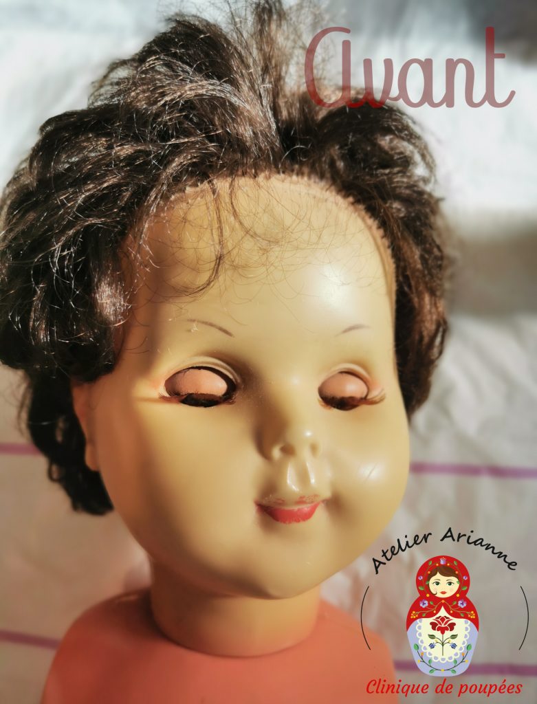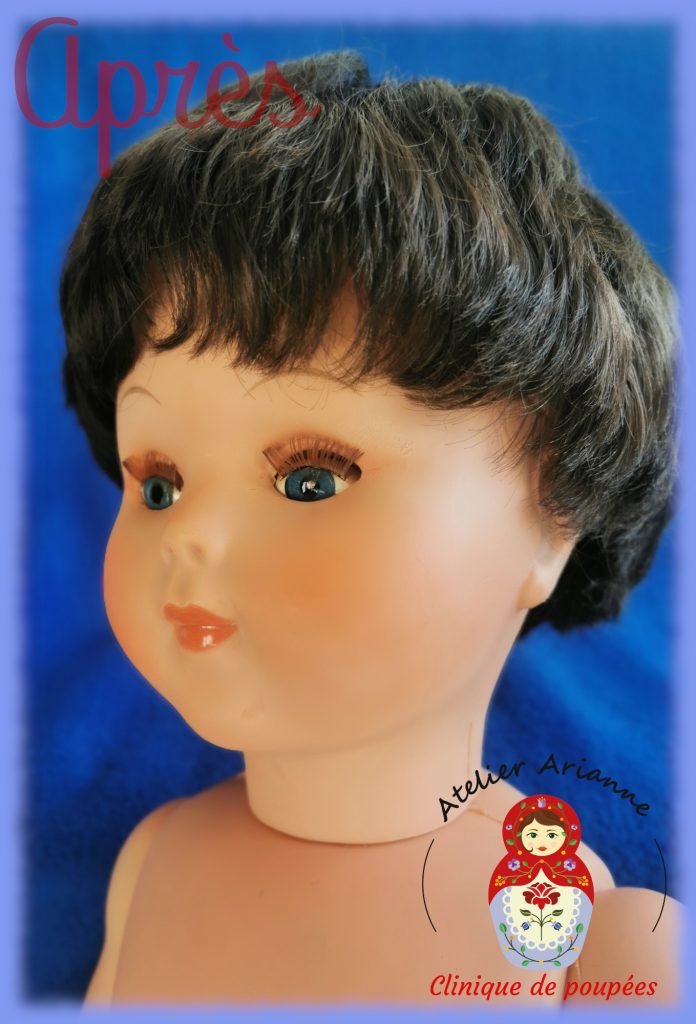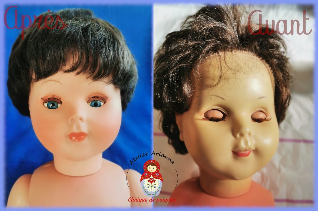 La réparation a été longue, il y avait beaucoup à faire. La poupée a d’abord été soigneusement nettoyée, y compris la tête. Ensuite, j’ai réparé les jambes, recoloré le visage, refait le maquillage, réparé les yeux, implanté les cheveux manquants, remis les élastiques et coiffé la poupée.