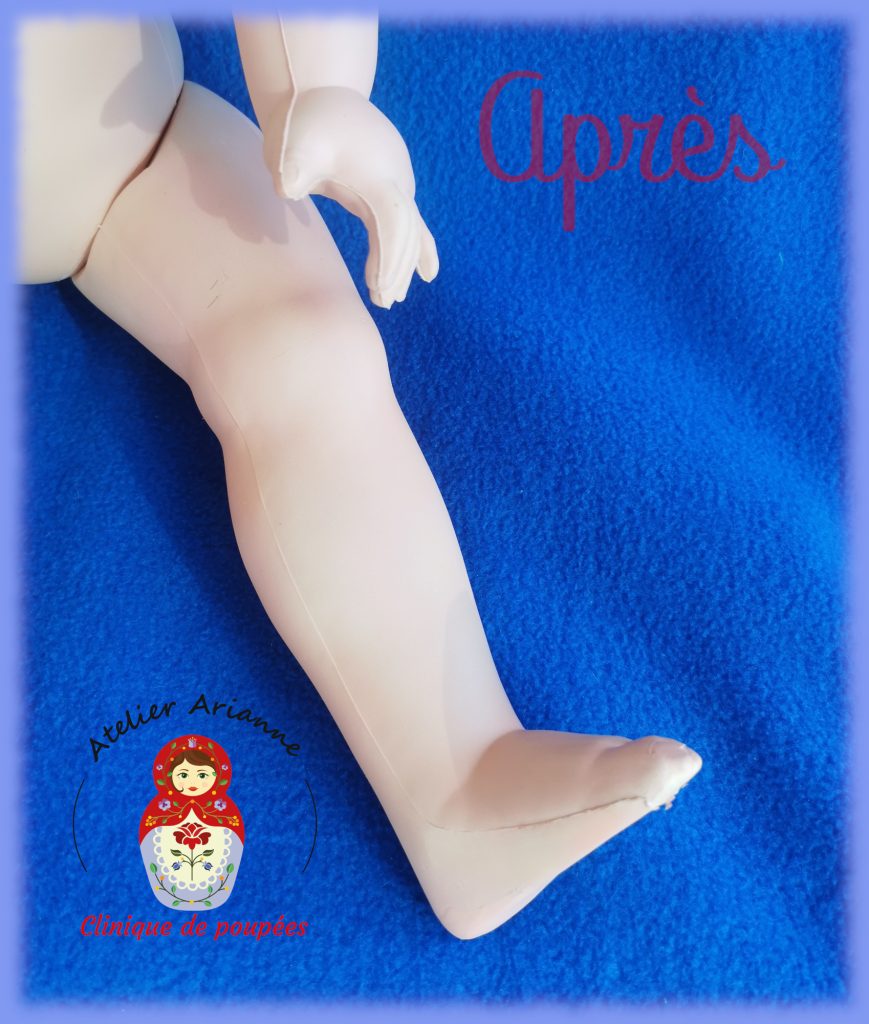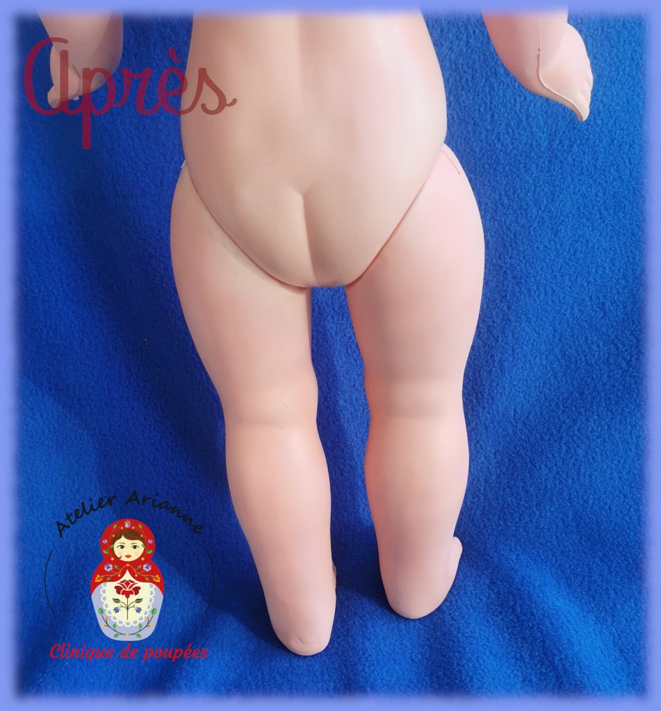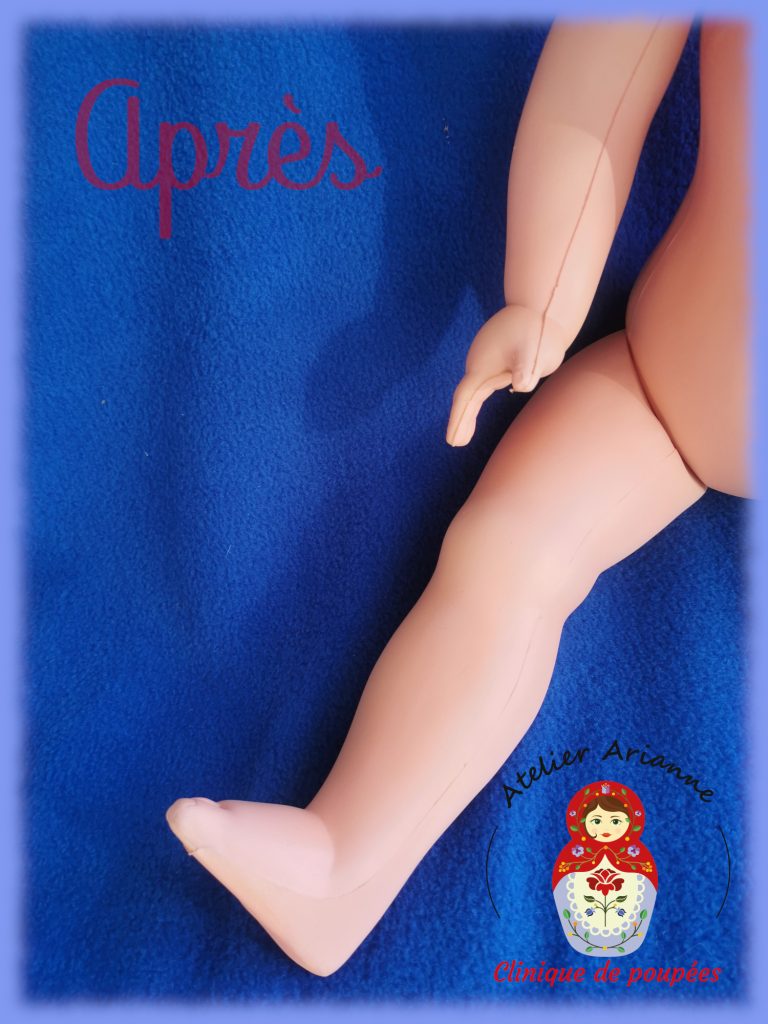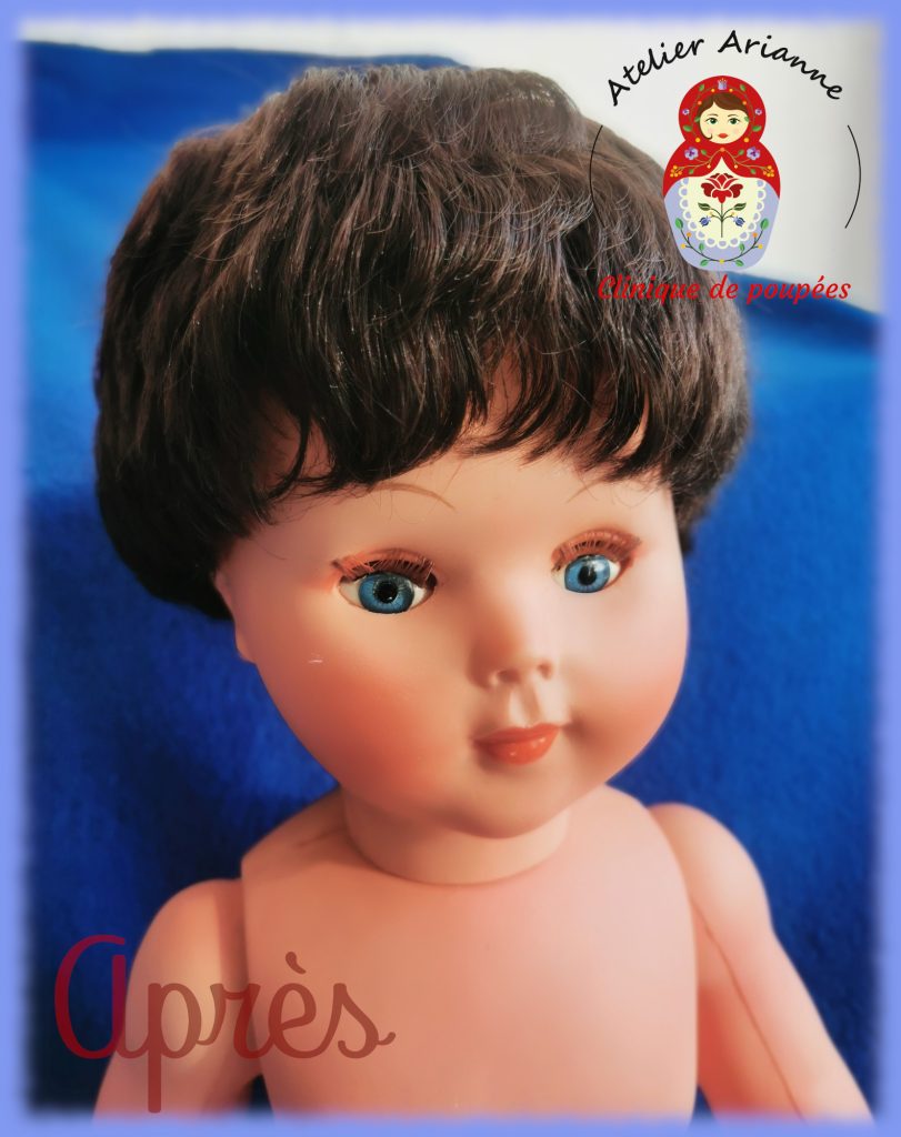 La réparation a été longue, il y avait beaucoup à faire. La poupée a d’abord été soigneusement nettoyée, y compris la tête. Ensuite, j’ai réparé les jambes, recoloré le visage, refait le maquillage, réparé les yeux, implanté les cheveux manquants, remis les élastiques et coiffé la poupée.