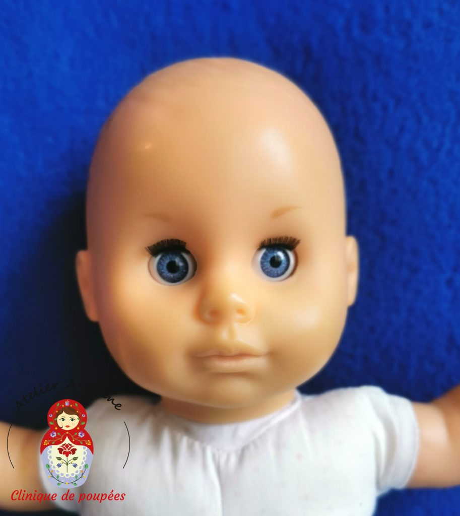La difficulté de ce travail a résidé dans le fait que ce poupon, est constitué d’un vinyle extrêmement rigide ce qui a rendu le remplacement de yeux très difficile.La méthode traditionnelle étant inefficace j’ai dû improviser une autre technique pour arriver à mes fins.