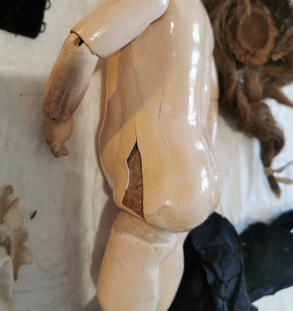 Déshabillage complet et mise en sécurité de la poupée Les vêtements ont été retirés avec la plus grande précaution afin de permettre une intervention sécurisée sur le corps, la tête et les articulations, sans contrainte ni tension sur le biscuit ou la structure ancienne.