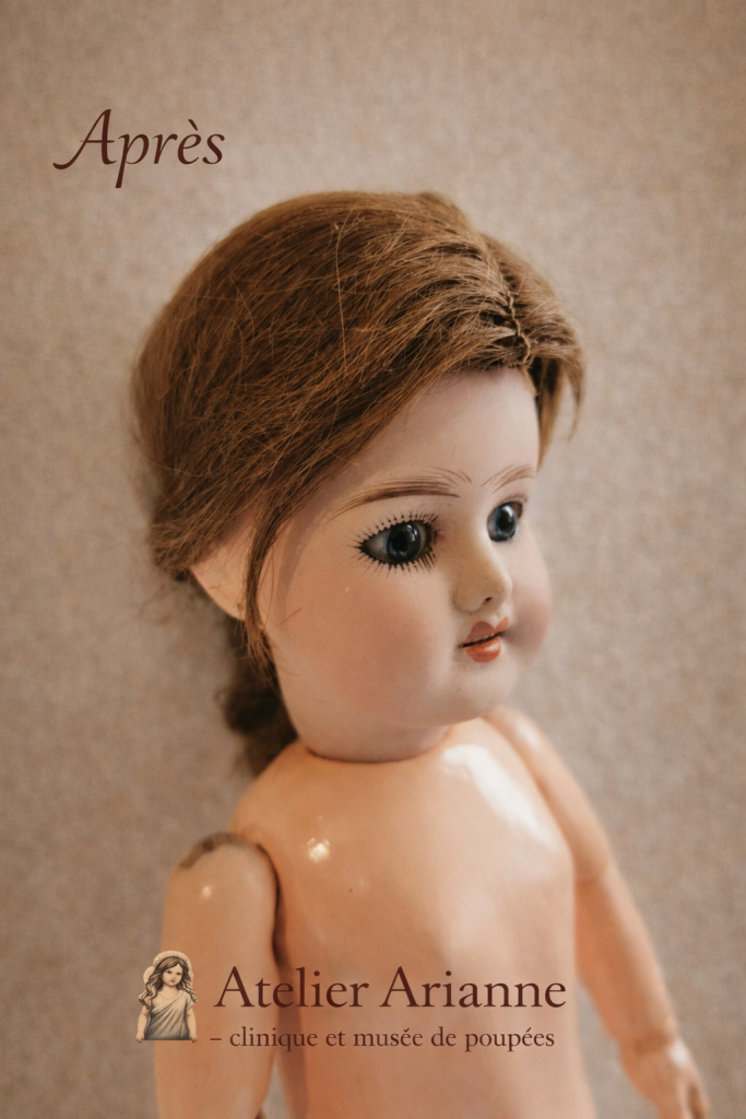 Le coiffage a ensuite été réalisé manuellement, mèche par mèche, afin de restituer un tombé naturel et une présentation conforme aux usages de l’époque de fabrication de la poupée.