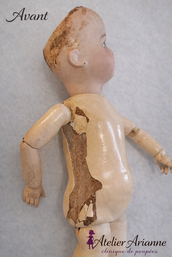 Dès son arrivée à la clinique, la poupée a fait l’objet d’une étude attentive : observation des matériaux, analyse des techniques de fabrication et évaluation de l’état général. Cette phase essentielle a permis d’établir un protocole d’intervention précis, cohérent et parfaitement adapté à une pièce ancienne.