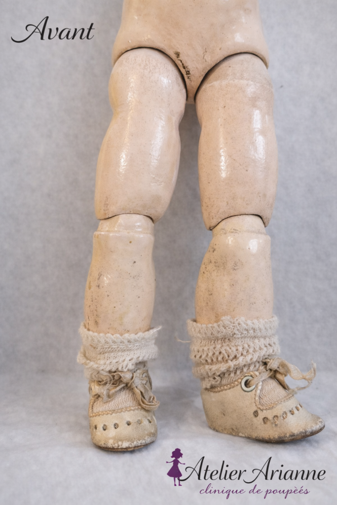 Remplacement des élastiques Les élastiques, devenus inadaptés avec le temps, ont été remplacés par des élastiques sélectionnés pour leur souplesse et leur résistance, permettant de redonner mobilité et maintien à la poupée sans exercer de tension excessive sur le biscuit ni sur le corps.
