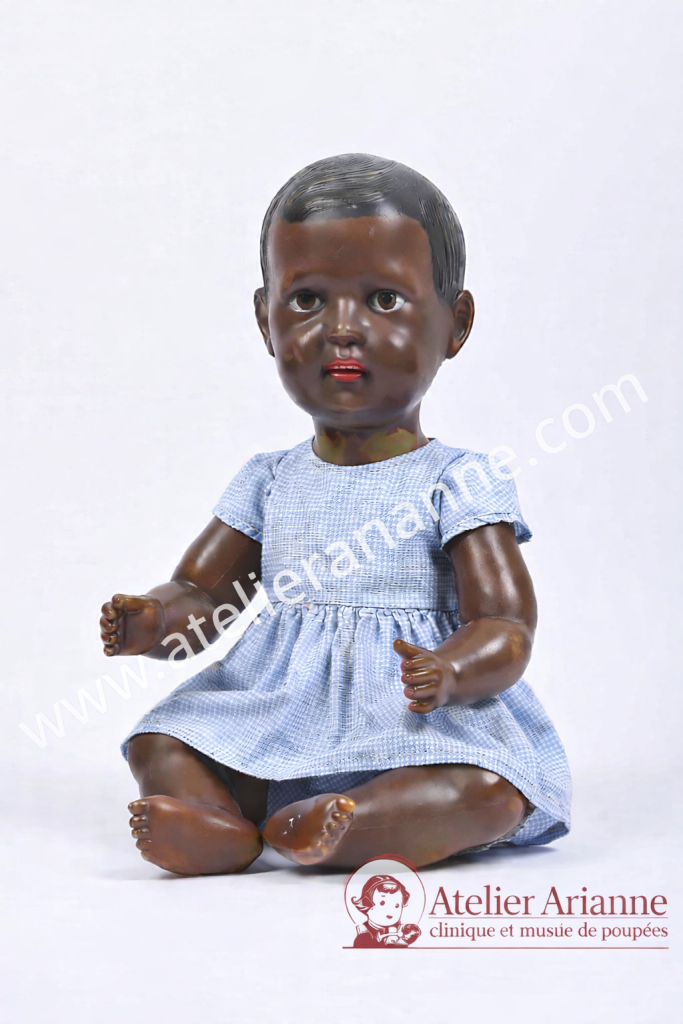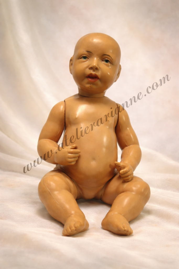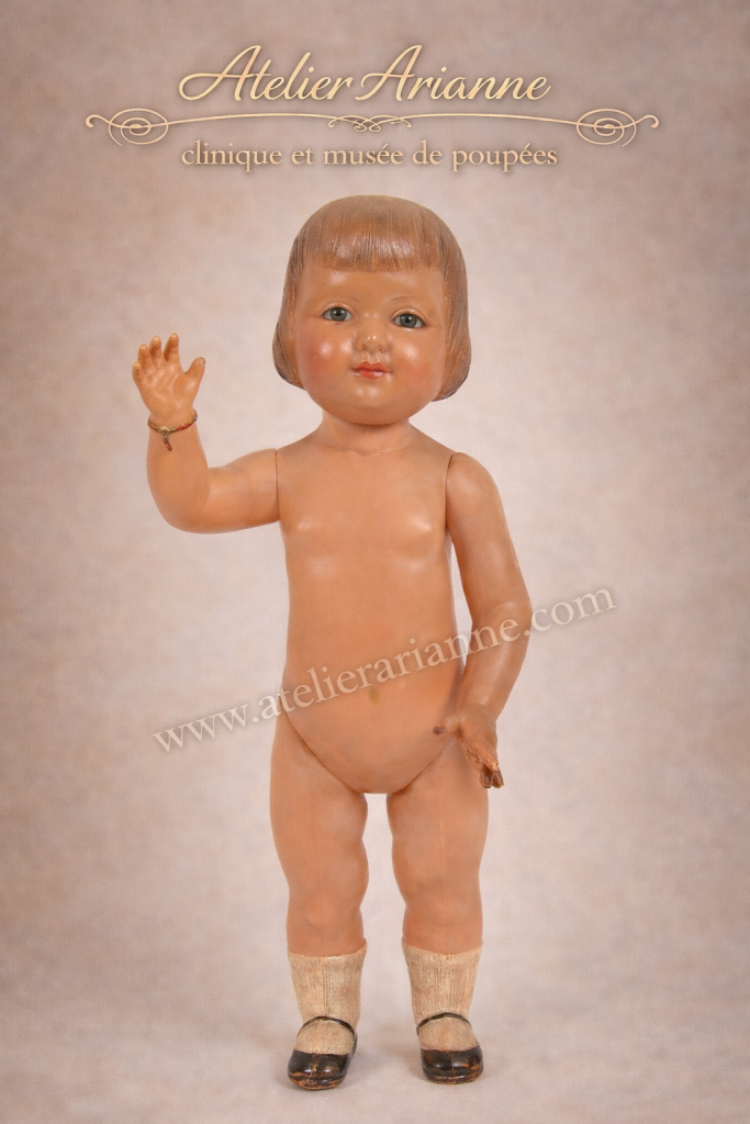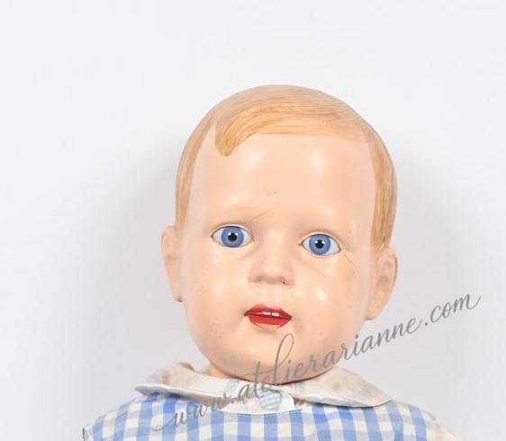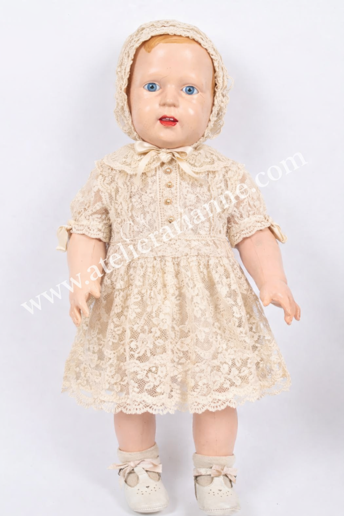 Poupée à perruque collée. Proposée en différentes tailles, avec variantes d’yeux (peints ou dormeurs selon les versions). Modèle davantage conçu comme poupée à habiller que comme baigneur classique.