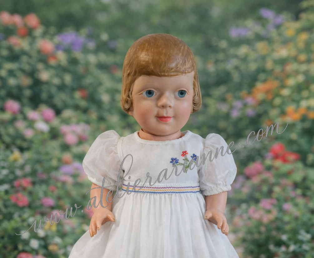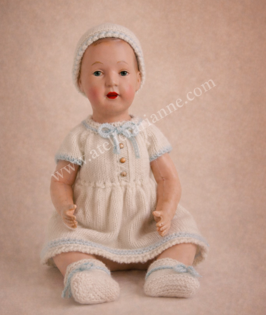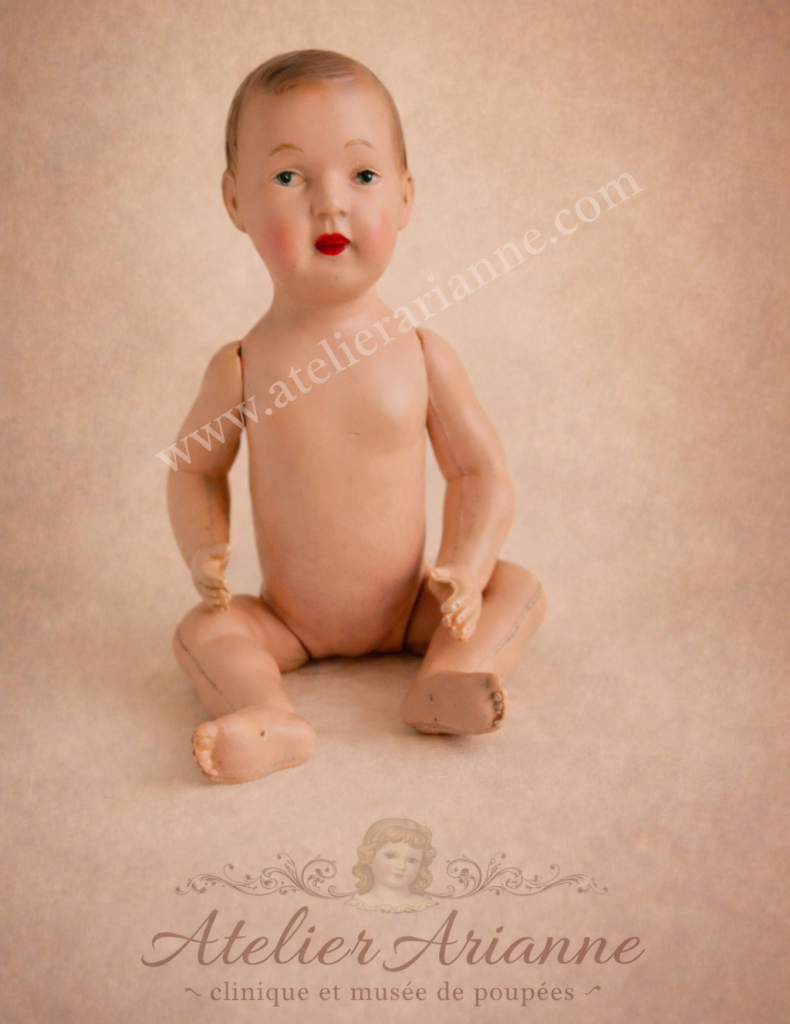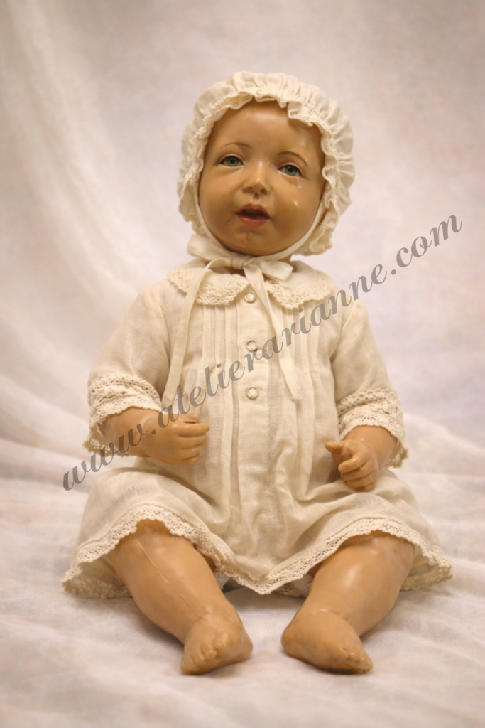 Poupée à perruque collée. Proposée en différentes tailles, avec variantes d’yeux (peints ou dormeurs selon les versions). Modèle davantage conçu comme poupée à habiller que comme baigneur classique.