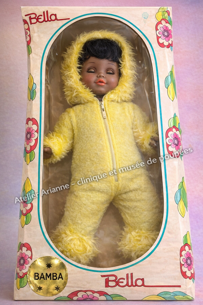 Bamba est un grand poupon Bella majeur des années 1970, identifiable avec certitude grâce à ses marquages, sa construction spécifique et ses caractéristiques uniques.