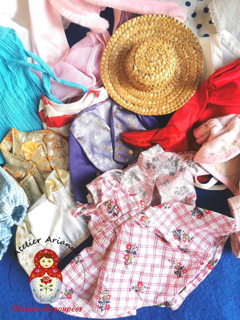 Il s’agit d’un ensemble de vêtements pour petites et grandes filles, d’un chapeau de paille, de chemises pour baigneurs et de cols qui embelliront les robes.