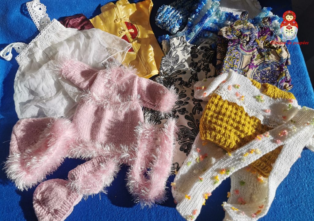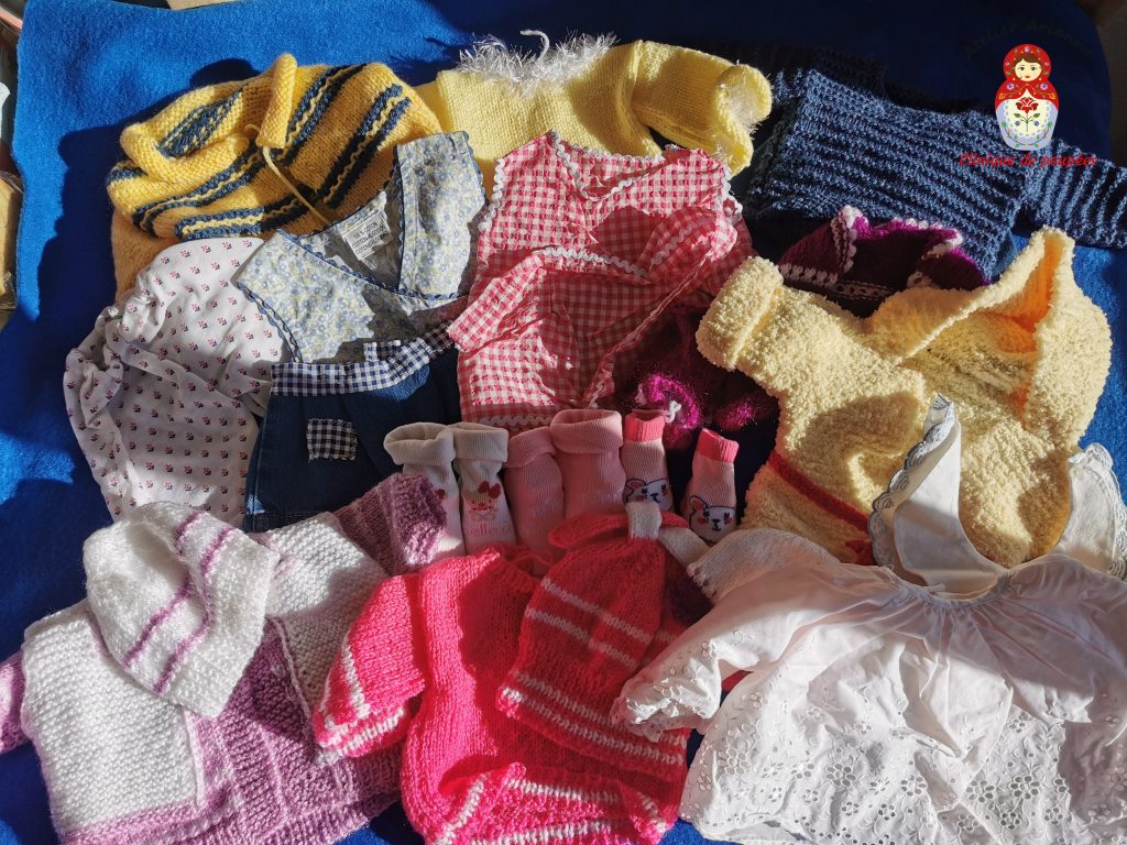 Le colis contient un nombre impressionnant de vêtements pour poupées confectionnés à la main par Mme Marie, ainsi que deux poupées Journey Girls, une poupée Corole, une poupée Berchet et une poupée Jesmar.