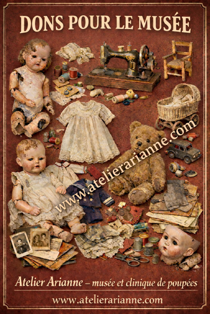 L’Atelier Arianne – clinique et musée de poupées a pour mission de préserver, restaurer, documenter et transmettre le patrimoine des poupées, jouets et objets liés à l’enfance, toutes périodes confondues, dès lors qu’ils présentent un intérêt historique, patrimonial, affectif, technique ou documentaire, qu’ils soient anciens, plus récents, complets ou très abîmés, dès lors qu’ils ont une histoire à transmettre.