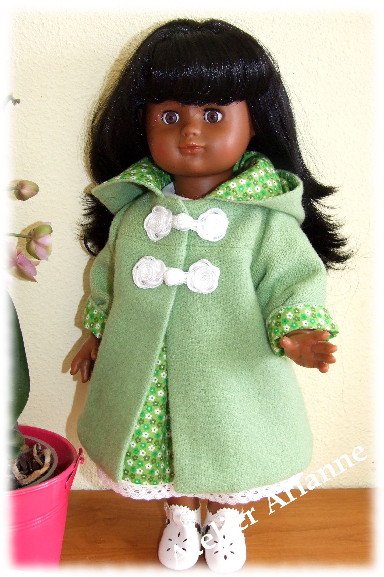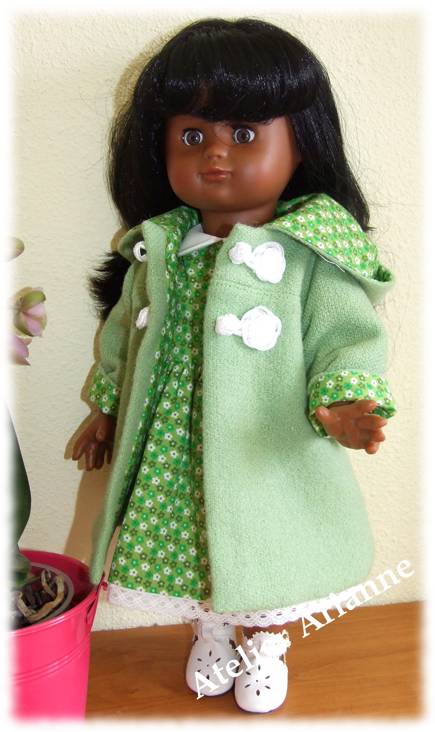 Manteau Enny pour poupée Emilie Modes et Travaux Poupée : M et T Taille : 39 cm pièces : 1, le duffle-coat Couleur : vert pomme Matériau : lainage et coton imprimé