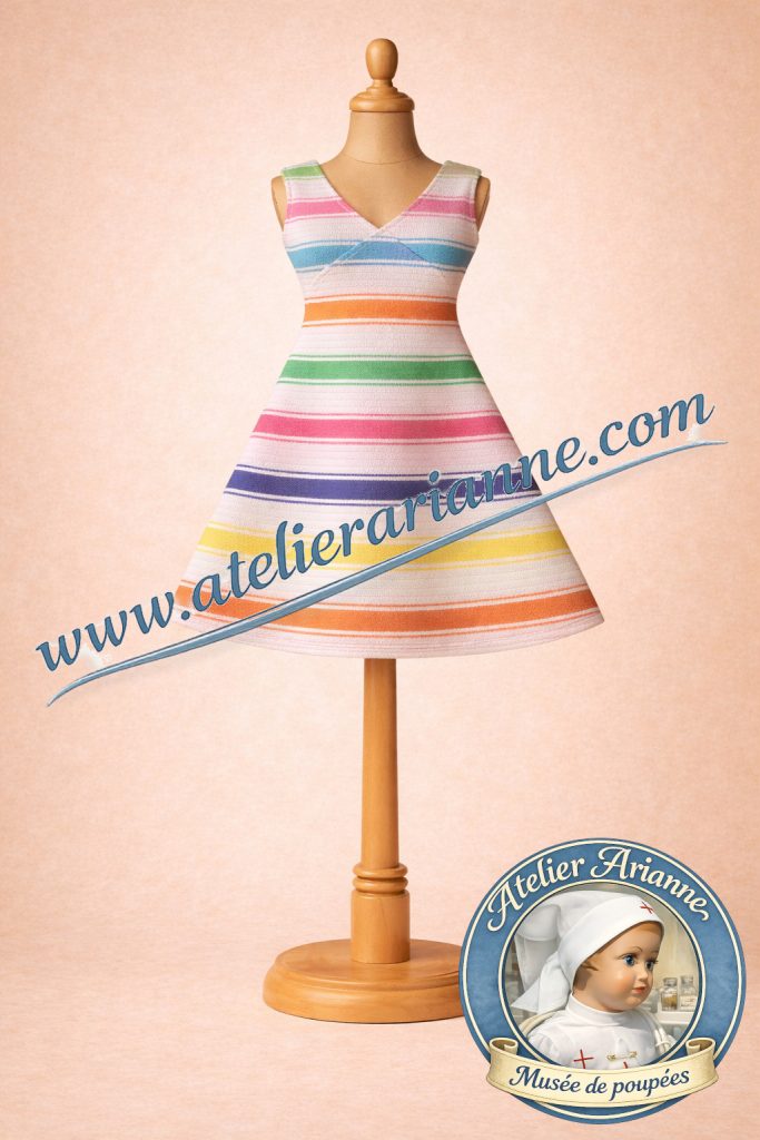 Robe emblématique présentée sur mannequin, caractérisée par ses rayures colorées et sa coupe évasée.