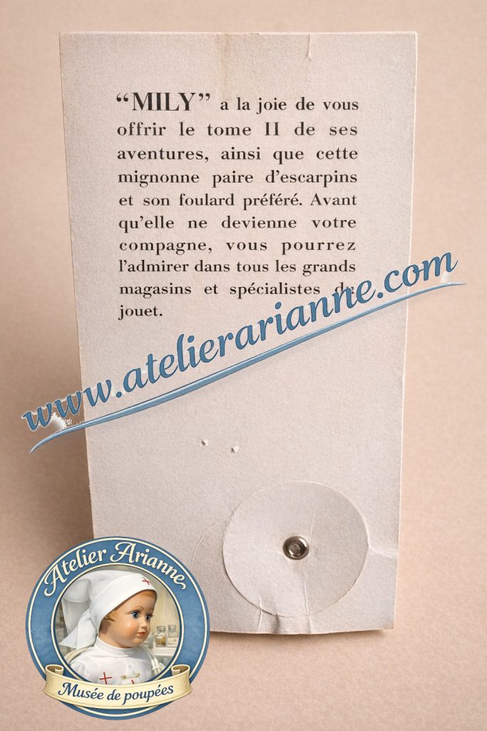 Carte imprimée accompagnant les accessoires ou la poupée, comportant un texte décrivant l’univers de Mily.