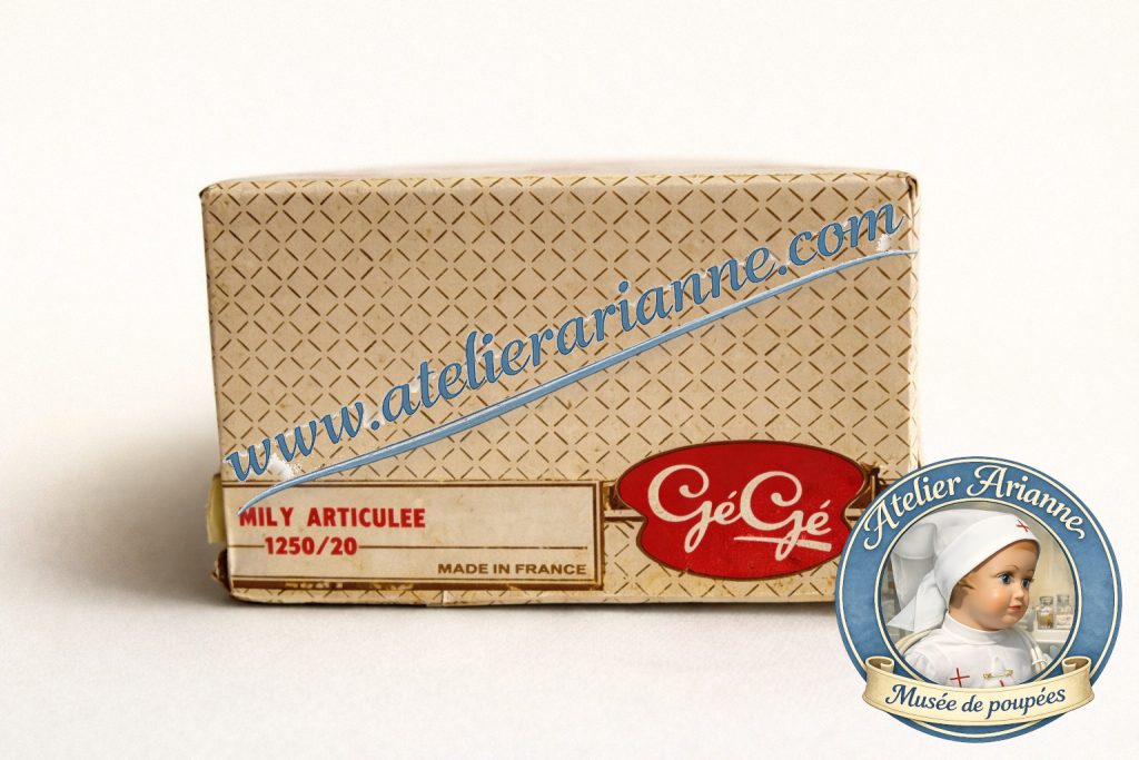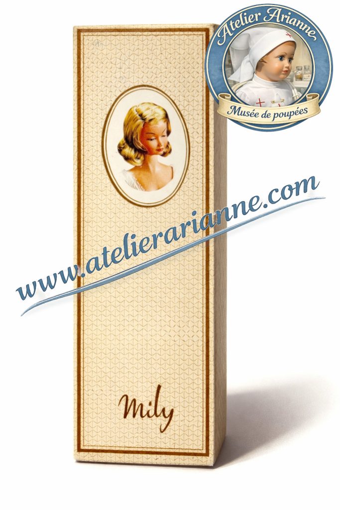Présentation de la poupée Mily dans son coffret d’origine, élément essentiel pour l’authentification et la compréhension du modèle.