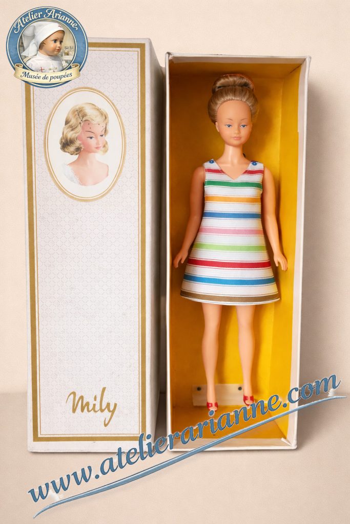Produite entre 1964 et 1976, dotée d’une identité visuelle remarquablement stable, d’une construction technique caractéristique et d’une garde-robe exceptionnelle d’environ 153 tenues, Mily demeure aujourd’hui l’une des grandes réussites de l’histoire du jouet français.