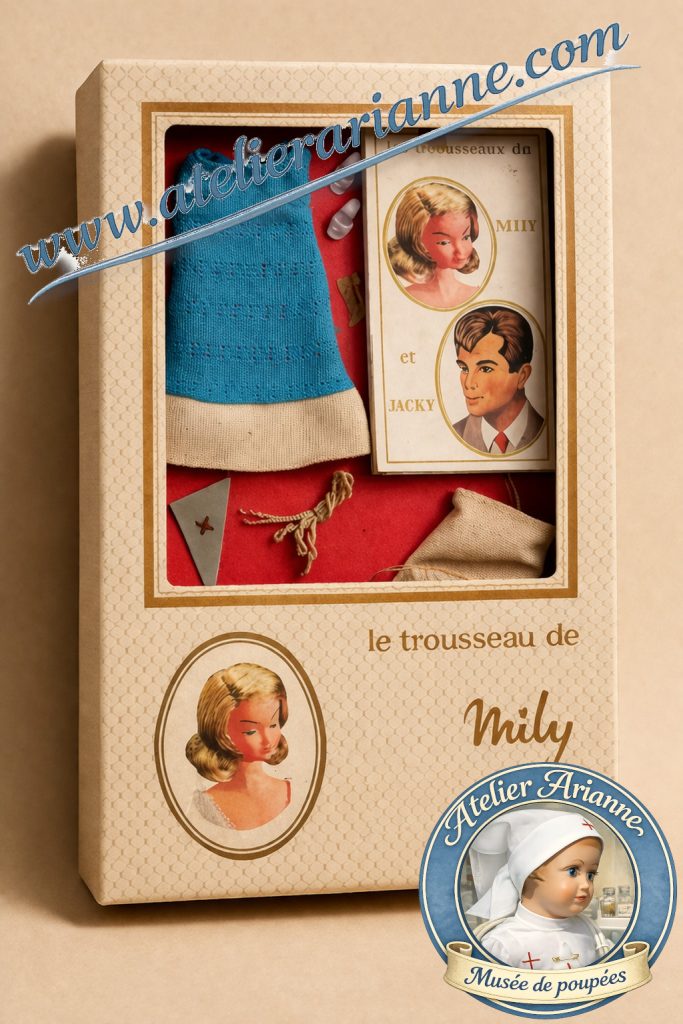 Présentation en boîte d’un ensemble vestimentaire complet destiné à la poupée Mily.