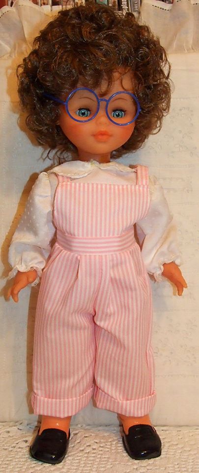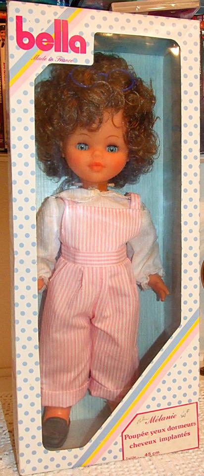 J’aimerais vous dire un petit peu plus sur cette petite Mélanie. Sa tenue et ses accessoires sont entièrement d’origine. Elle est dans sa boite d’origine, elle n’a jamais été jouée ni meme sortie de sa boite.Elle est de la marque Bella de l’époque Berchet. Elle date de 1984. Sa taille est de 45 cm.Elle est faite en PVC. Son montage est fait par emboîtement , ses beaux cheveux bouclés, très fournis sont implantés. Ses yeux bleus, existent aussi en marron pour ce modèle. Sa chevelure peut aussi être blonde ou brune très foncée pour ce modèle de Bella. Elle est marquée sur la nuque en creux : 45-14 BELLA et sur le dos entre les omoplates : ”Bella” , Made in France , breveté SGDG