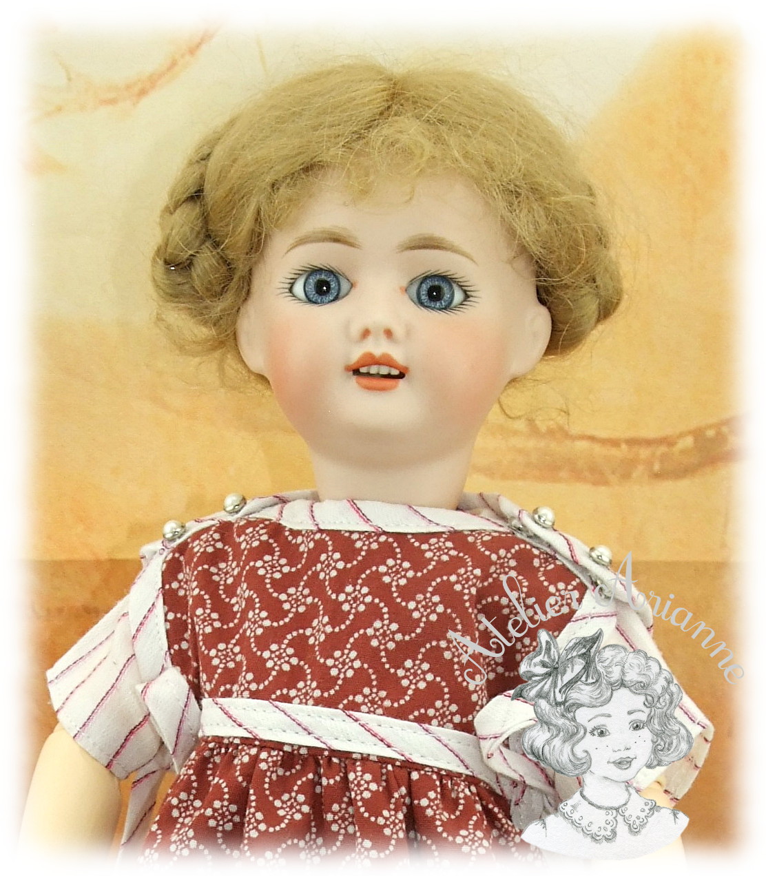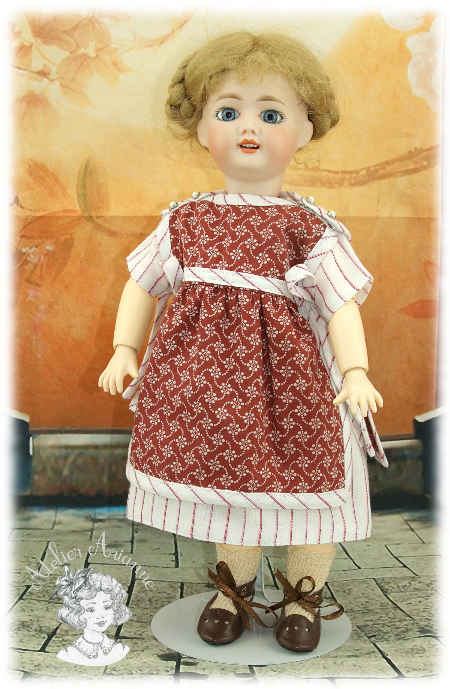 Voici une charmante robe ainsi que son tablier assorti confectionnés d’après le modèle paru en février 1923 dans le magazine “La semaine de Suzette” Réalisée en popeline d’époque , le principal atout de cette petite tenue est le biais assorti à la robe qui embellit le tour du tablier. Tout comme dans l’original, l’étoffe du tablier est fluide et légère, ornée d’un minuscule motif fleuri. Poupée : Bleuette Taille : 27 cm Pièces : 2 , la robe et le tablier Coloris : rouge grénat et blanc cassé