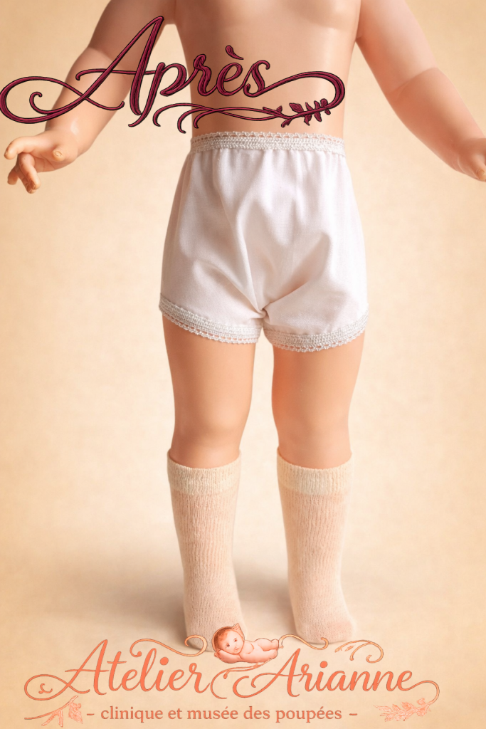 — Une culotte, terminée par une dentelle élastique ajourée d’époque, évoquant la lingerie miniature des poupées de cette période.