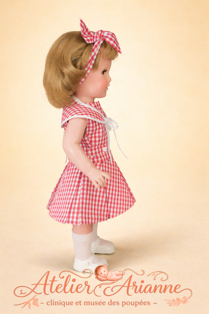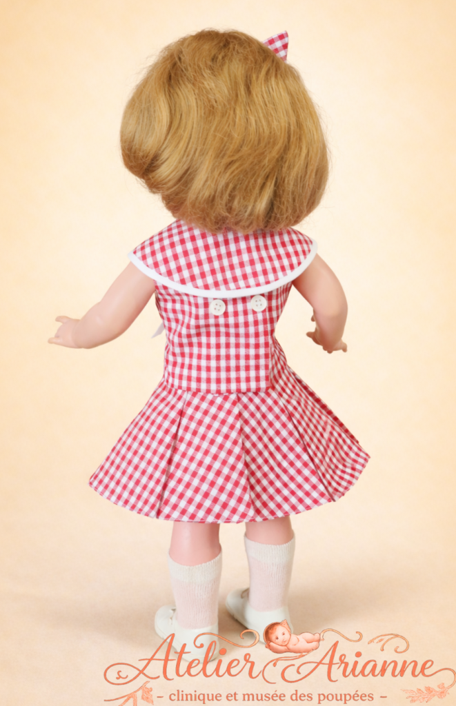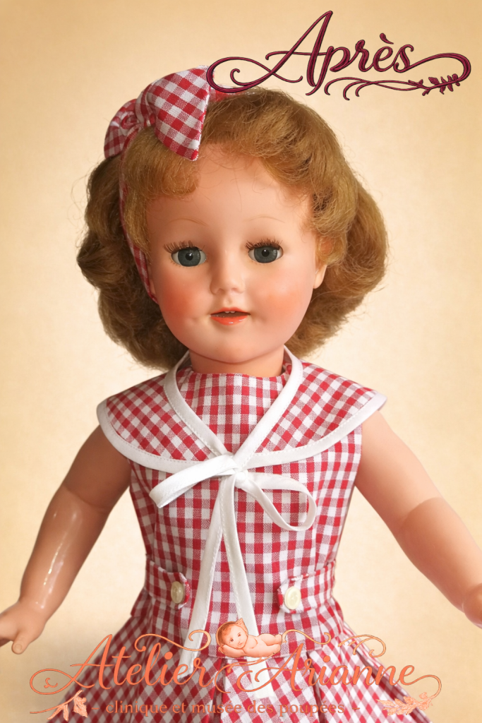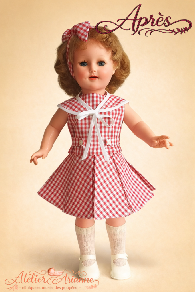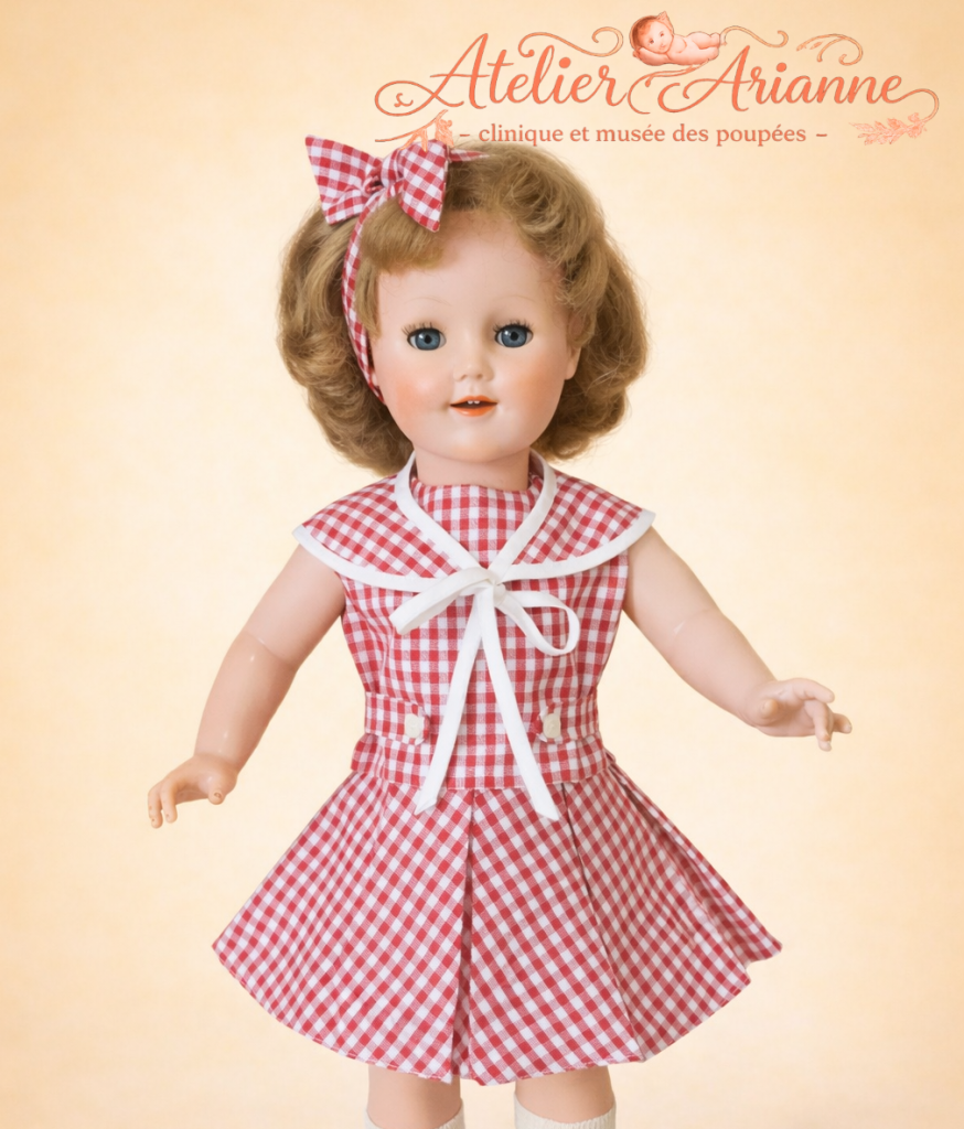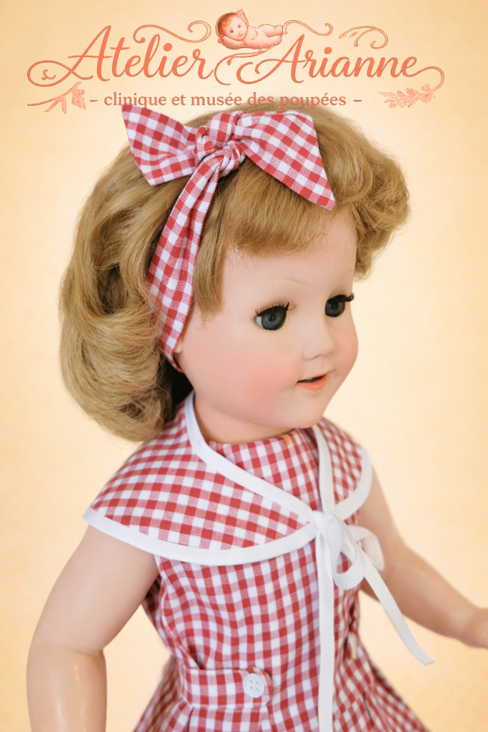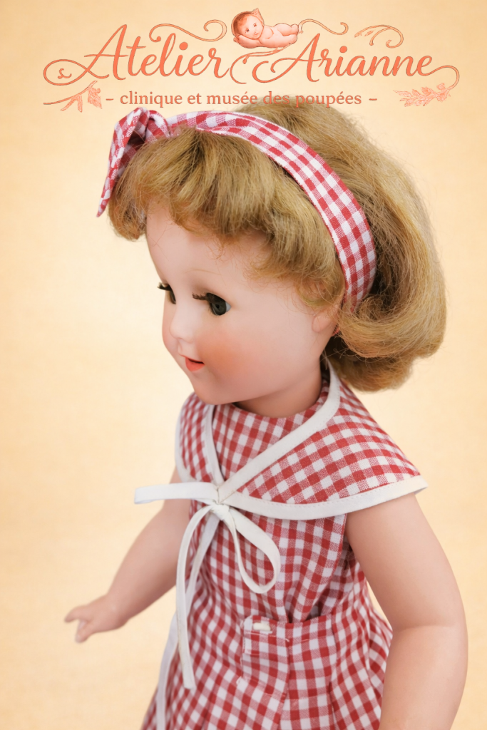Restauration d’une poupée Raynal ancienne : nettoyage, traitement des taches, coiffure et reproduction d’une tenue de poupée en Vichy. Travail de restauration réalisé par la clinique de poupées Atelier Arianne en France.