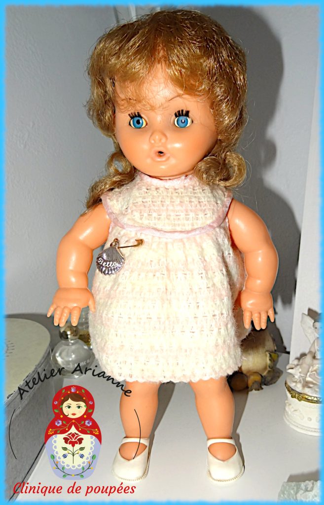 “Les poupées Bella entre 1964 et 1971 font partie des poupées de mon enfance comme cette petite Bella Poussinette avec sa robe et ses chaussures d’origine. Précisions supplémentaires: Elle fait partie de la Série PF “Petites filles” 1959/1963. Celle-ci est une PF1 Poussinette blonde de 25 cm. “