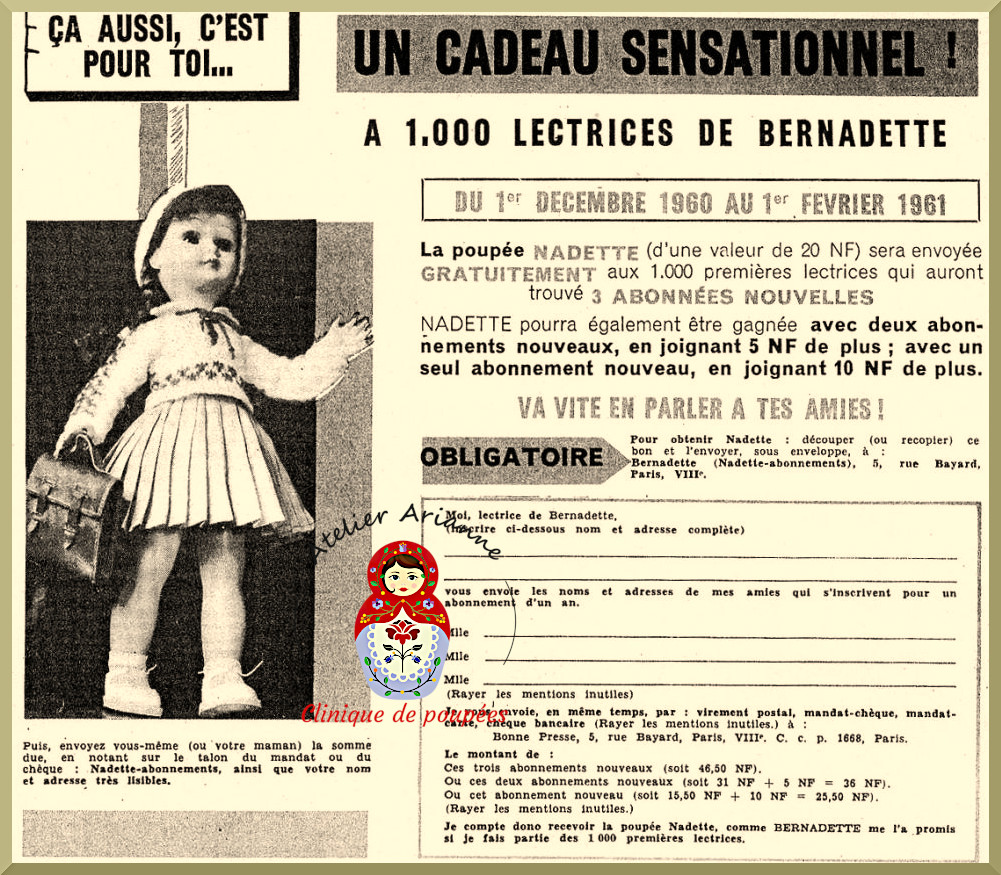Le journal Bernadette publie des patrons de vêtements pour ces jeunes filles, que leurs mères pouvaient réaliser pour leurs poupées Nadette.
