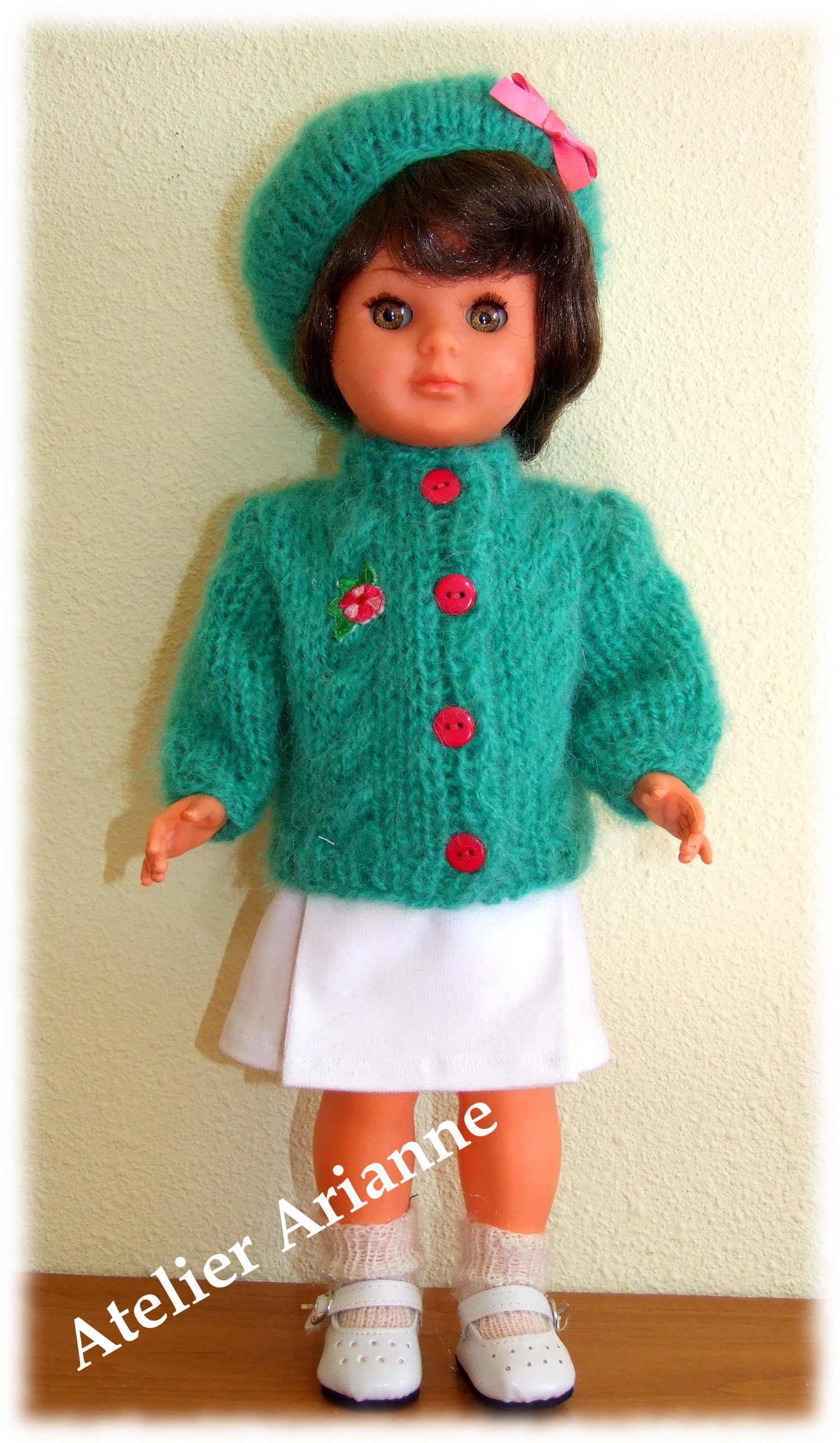 Ensemble gilet, béret en mohair et jupe Tenue tricot et couture pour poupées Modes et TravauxPoupée : Françoise , Marie – Françoise, Louise et FrancetteTaille : 39 / 40 cmpièces : 3 Matériau : mohair et velours côtelé Couleurs : blanc, fushia et vert jade