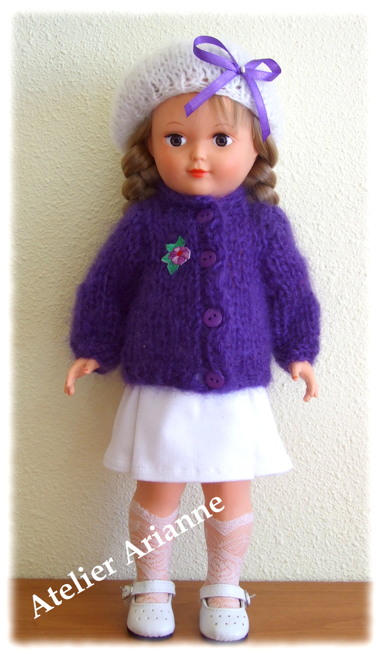 Ensemble gilet, béret en mohair et jupe Tenue tricot et couture pour poupées Modes et TravauxPoupée : Françoise , Marie – Françoise, Louise et FrancetteTaille : 39 / 40 cmpièces : 3 Matériau : mohair et velours côtelé Couleurs : blanc et violet