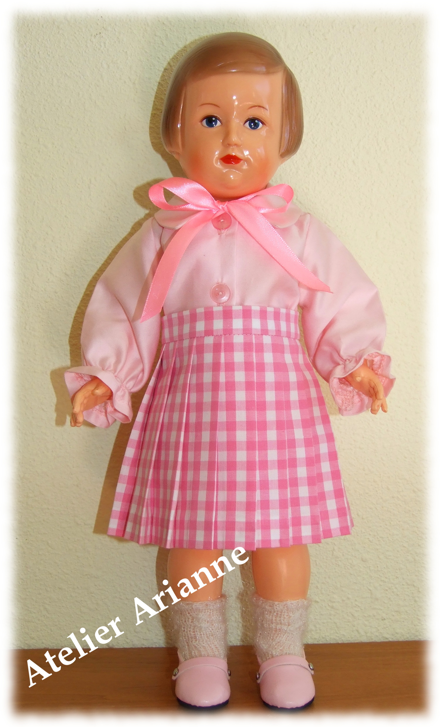 Chemise et jupe plissée pour poupée Modes et Travaux Poupée : Françoise , Marie-Françoise , Francette, Louise La taille de la poupée : 39 / 40 cm 3 pièces : chemise, jupe et ruban Couleur : rose Matériau : coton avec polyester
