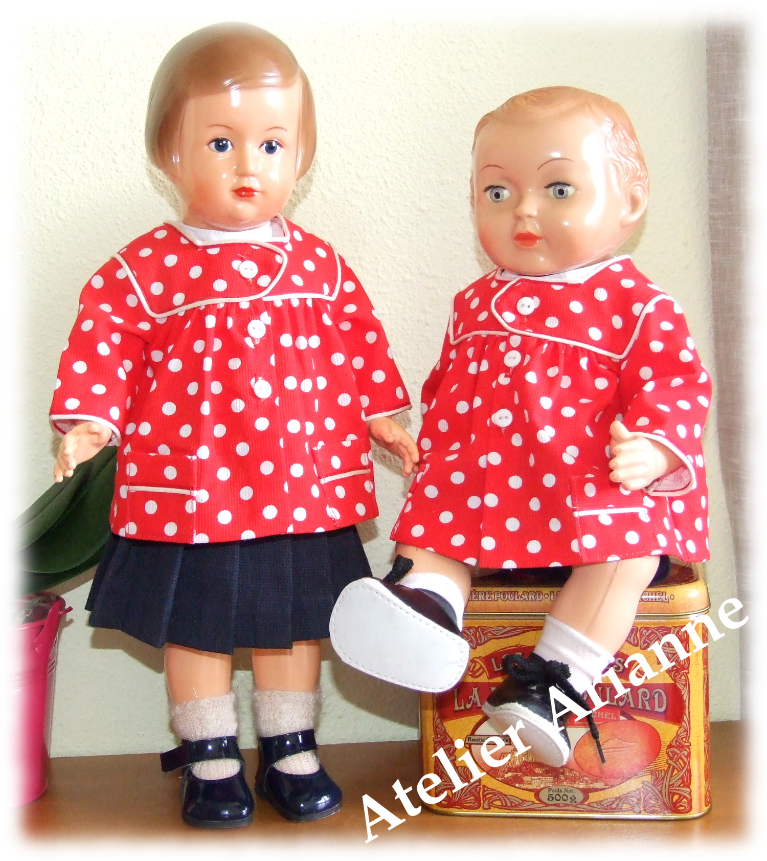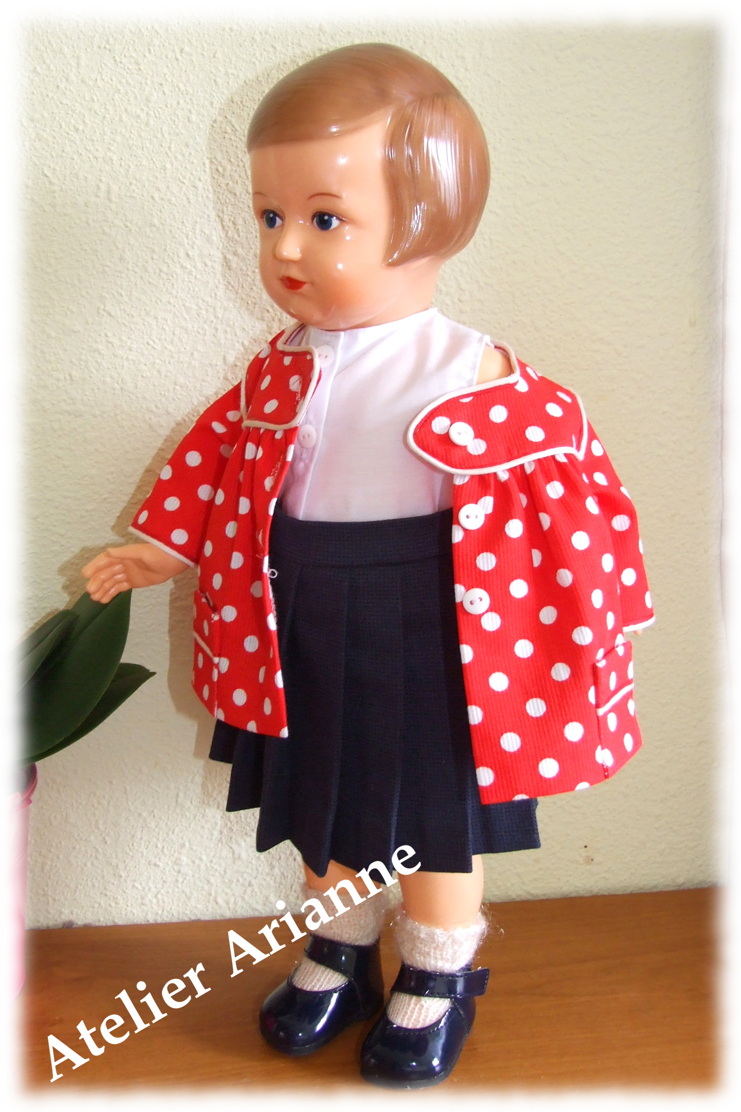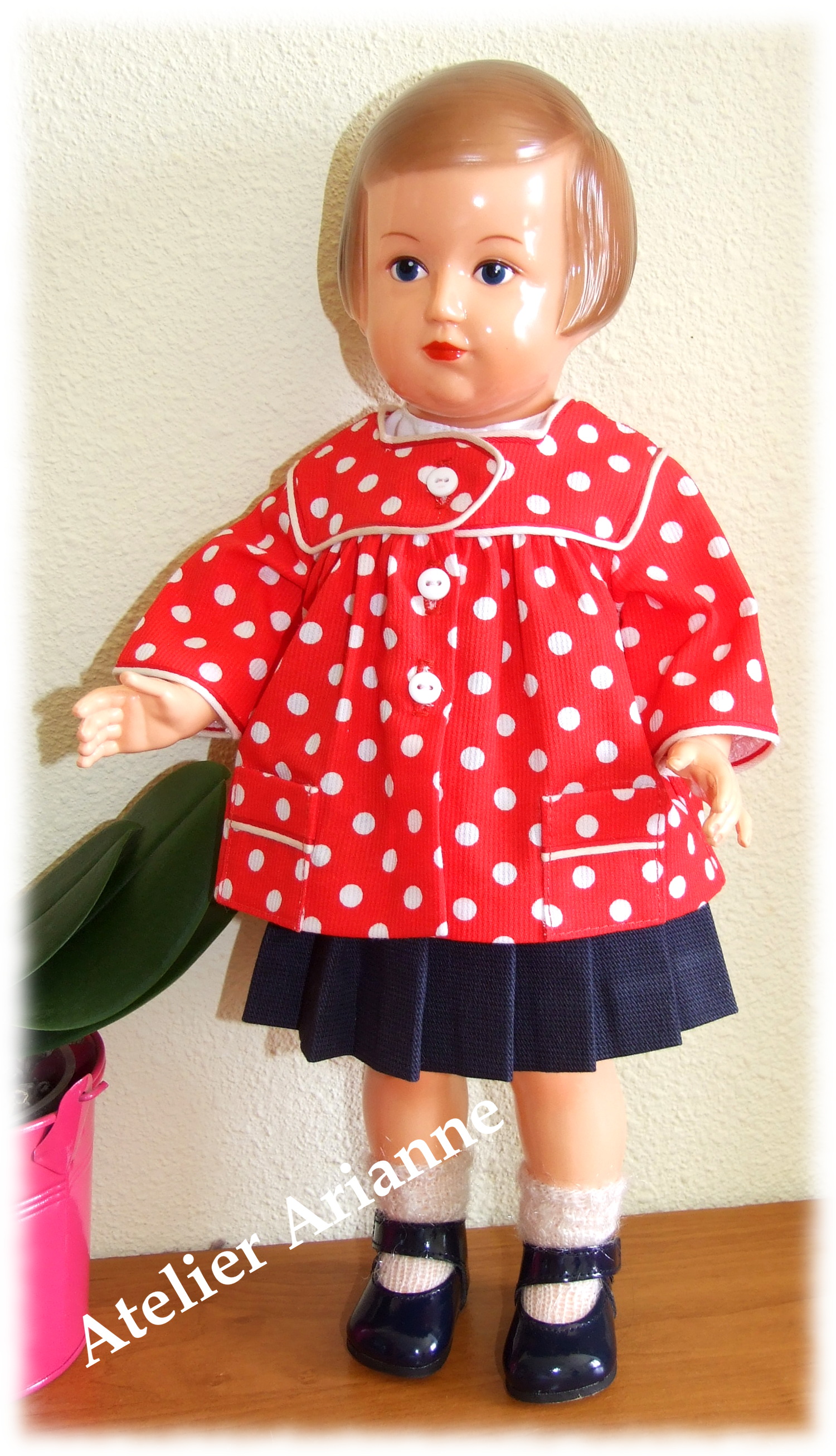 Date : Septembre 1959 Poupées : Françoise, Francette, Louise… La taille de la poupée : 39 / 40 cm 3 pièces : chemisette, tablier et jupe plissée Couleur : rouge, blanc, bleu marine