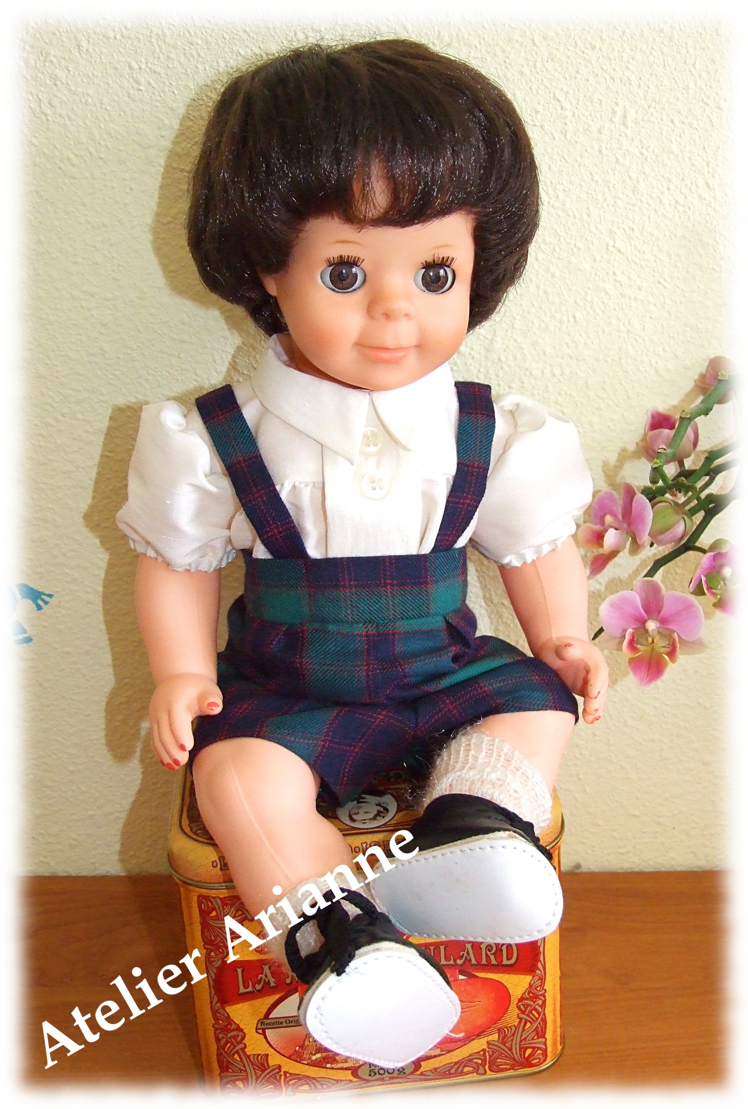 Tenue pour poupées de Modes et Travaux Date : Mars 1962 Poupée : Michel Taille : 39 / 40 cm Nombre de pièces : 2 Couleur : vert et blanc Matériau : tissus d’époque