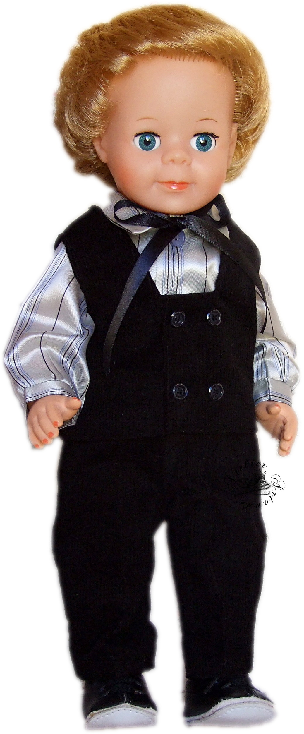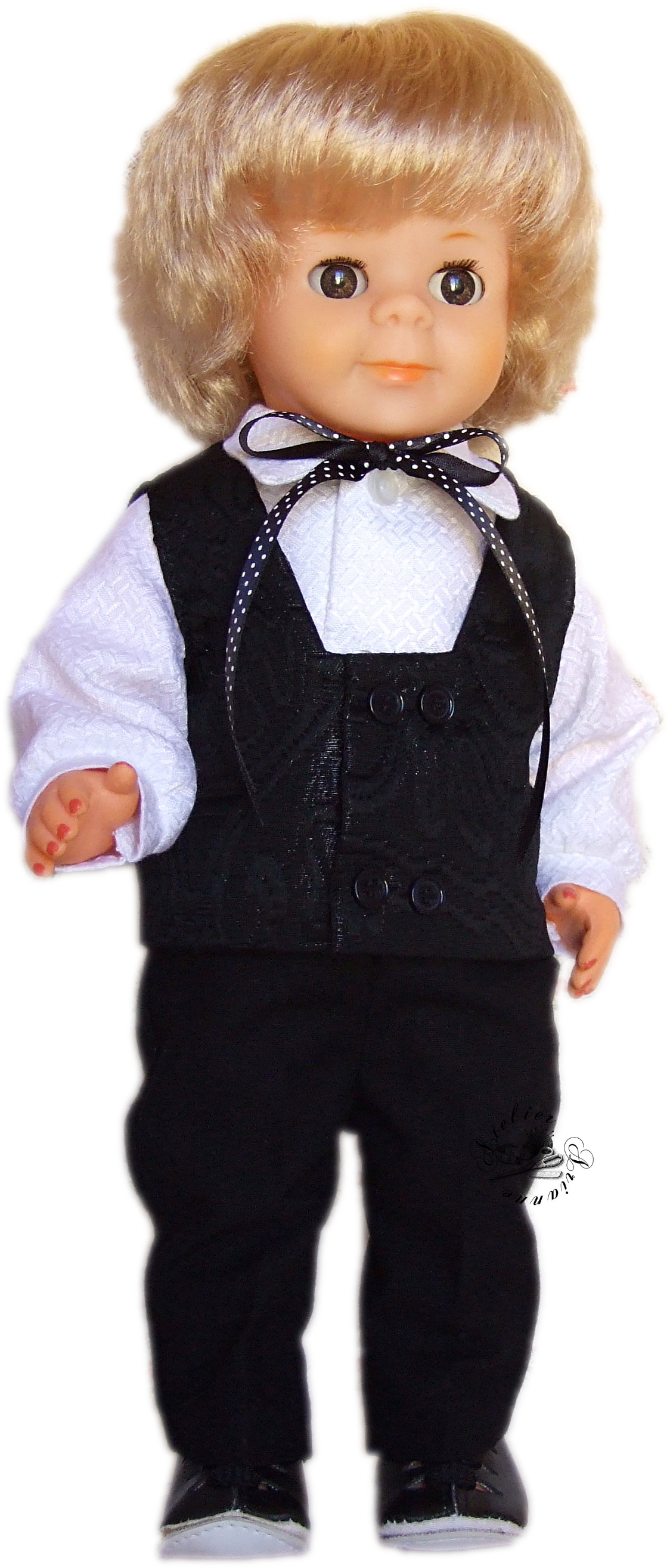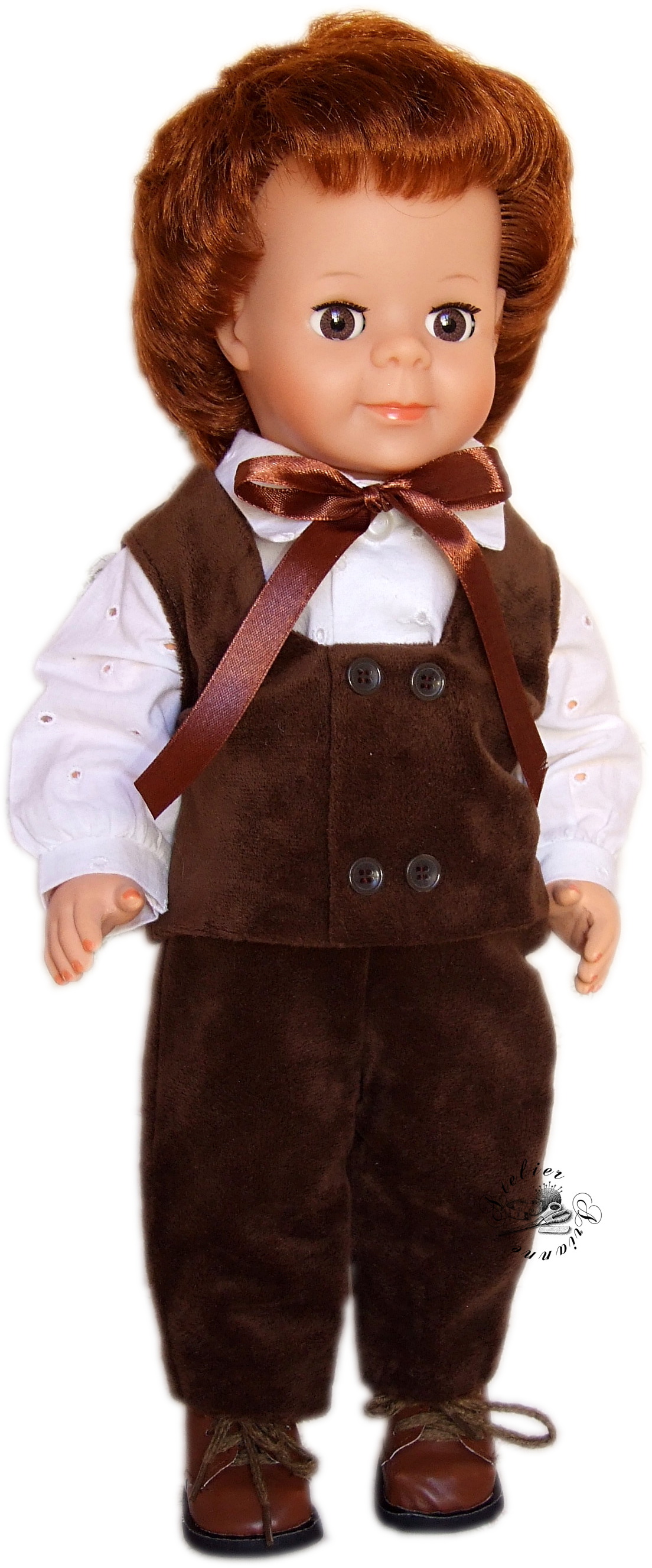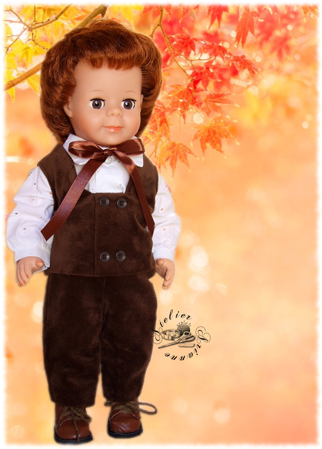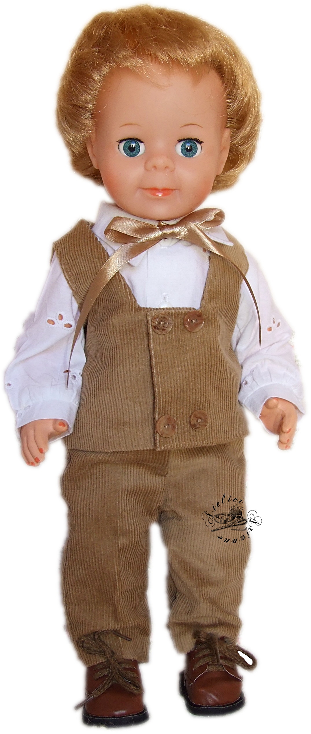 Date: Octobre 1970 Poupée : Jean-Michel Taille : 39 / 40 cm pièces : 3 : la chemise, la pantalon et le gilet Matériau : velours et broderie anglaise
