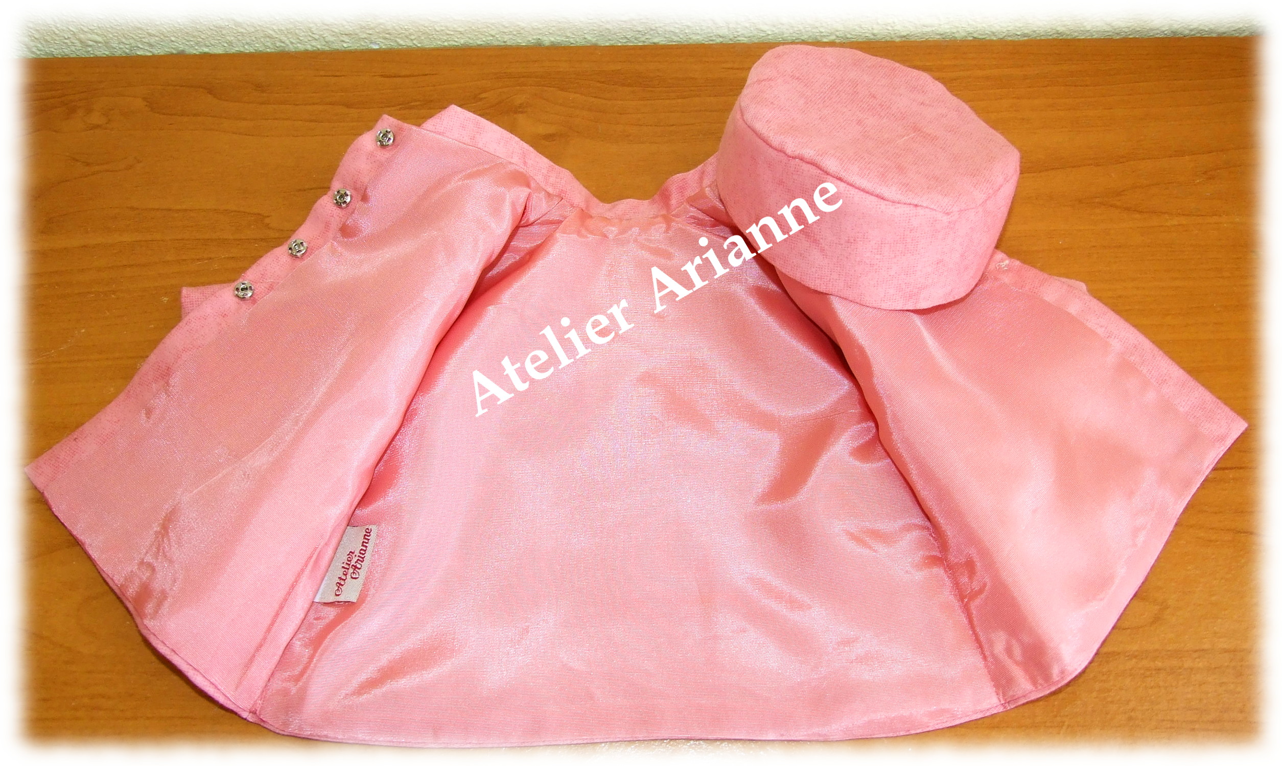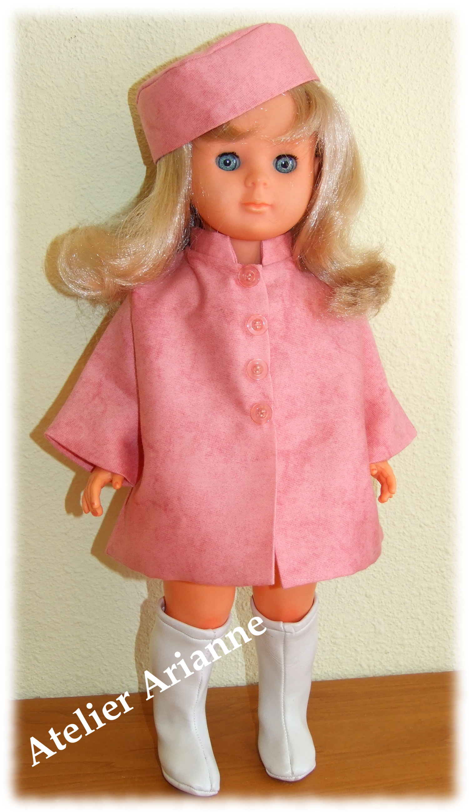 Tenue pour poupée Modes et Travaux Date : Novembre 1964 Poupée : Louise , Marie – Françoise, Louise et Francette Taille : 39 / 40 cm pièces : 2 , le manteau doublé et la toque Couleur : vieux rose Matériau : tissu d’habillement ancien