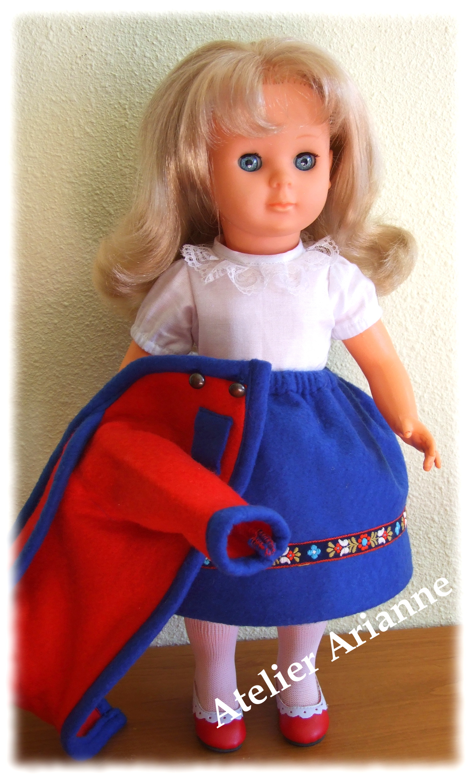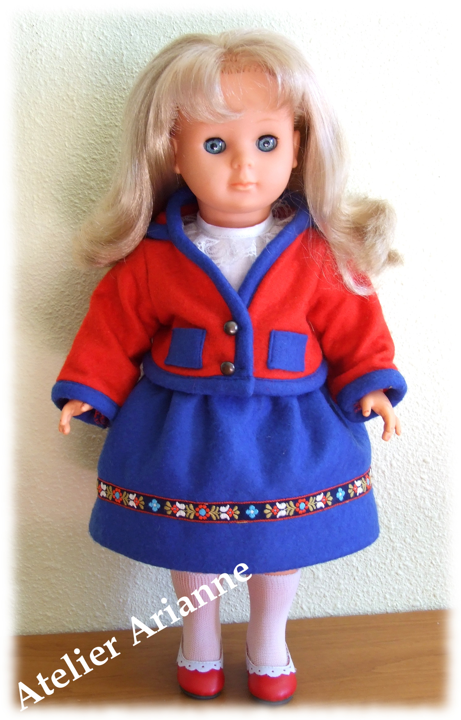 Tenue pour poupée Modes et Travaux Date : Septembre 1986 Poupée : Louise , Marie – Françoise, et Francette Taille : 39 / 40 cm pièces : 3 , La veste, la jupe et la chemise Couleur : rouge, bleu, blanc Matériau : feutrine et coton