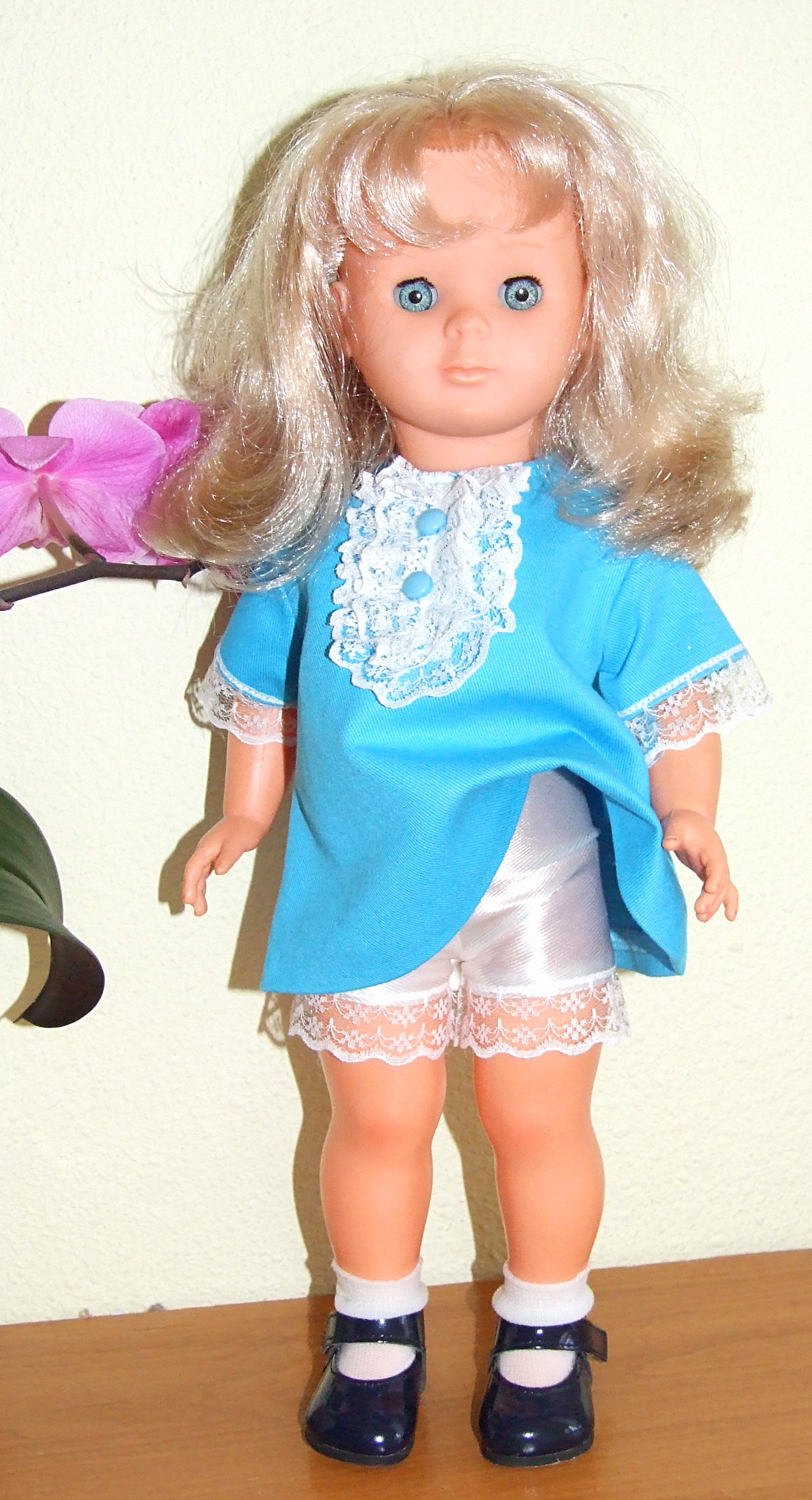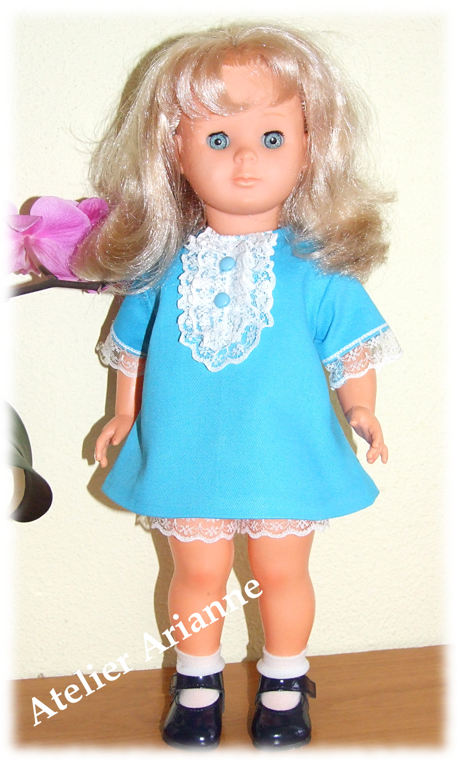 Tenue pour poupée Françoise Modes et Travaux Octobre 1968 Poupée : Françoise , Marie – Françoise et Francette Taille : 39 / 40 cm Pièces : 2 – robe et culotte Couleur : turquoise et blanc Matériau : serge et jersey en satin d’époque